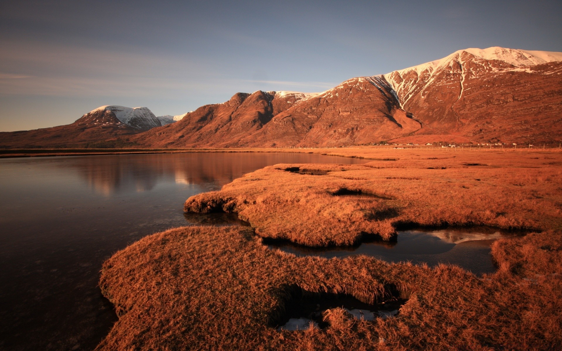 Albero solitario vicino al lago tra le montagne sullo sfondo del tramonto
