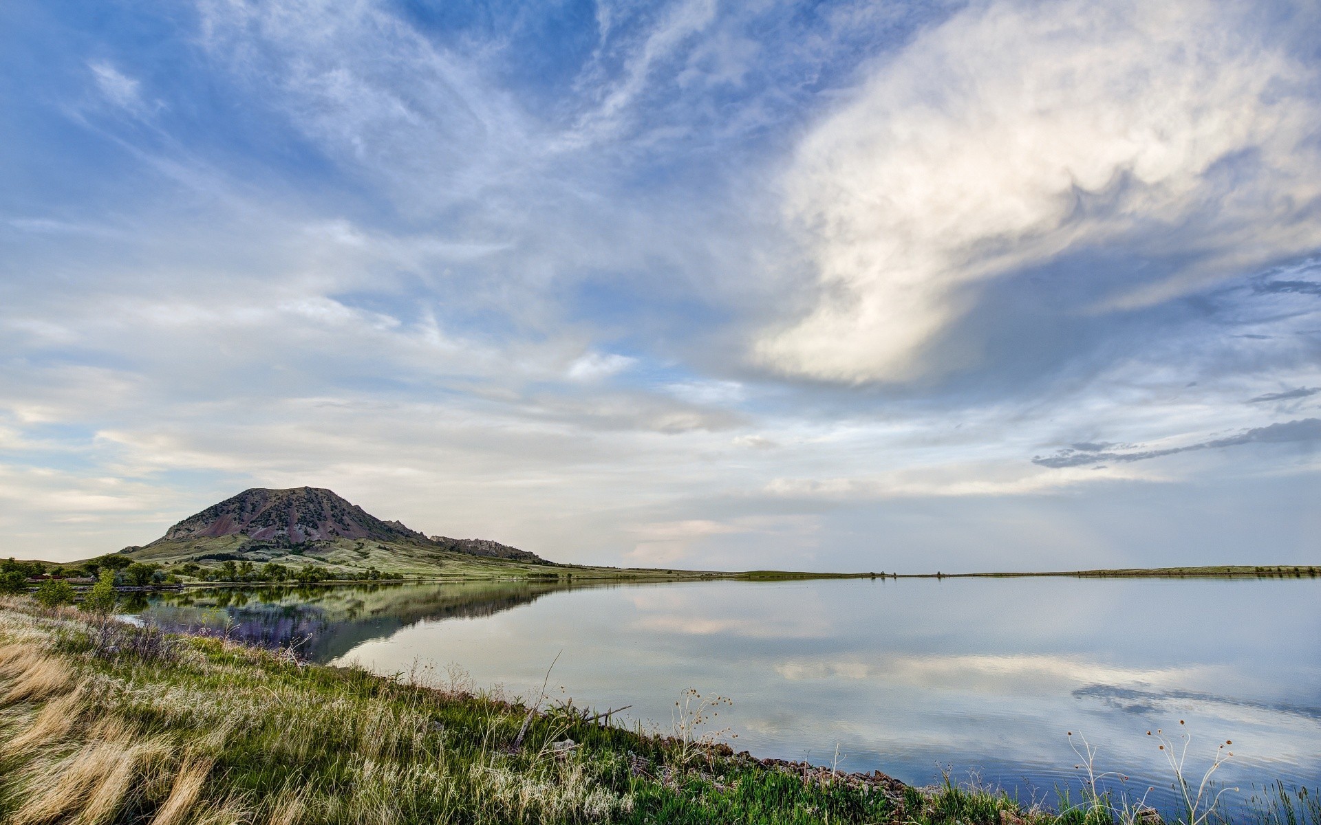Lago in montagna piccole increspature che corrono sull'acqua seguendo le nuvole pesanti in fuga