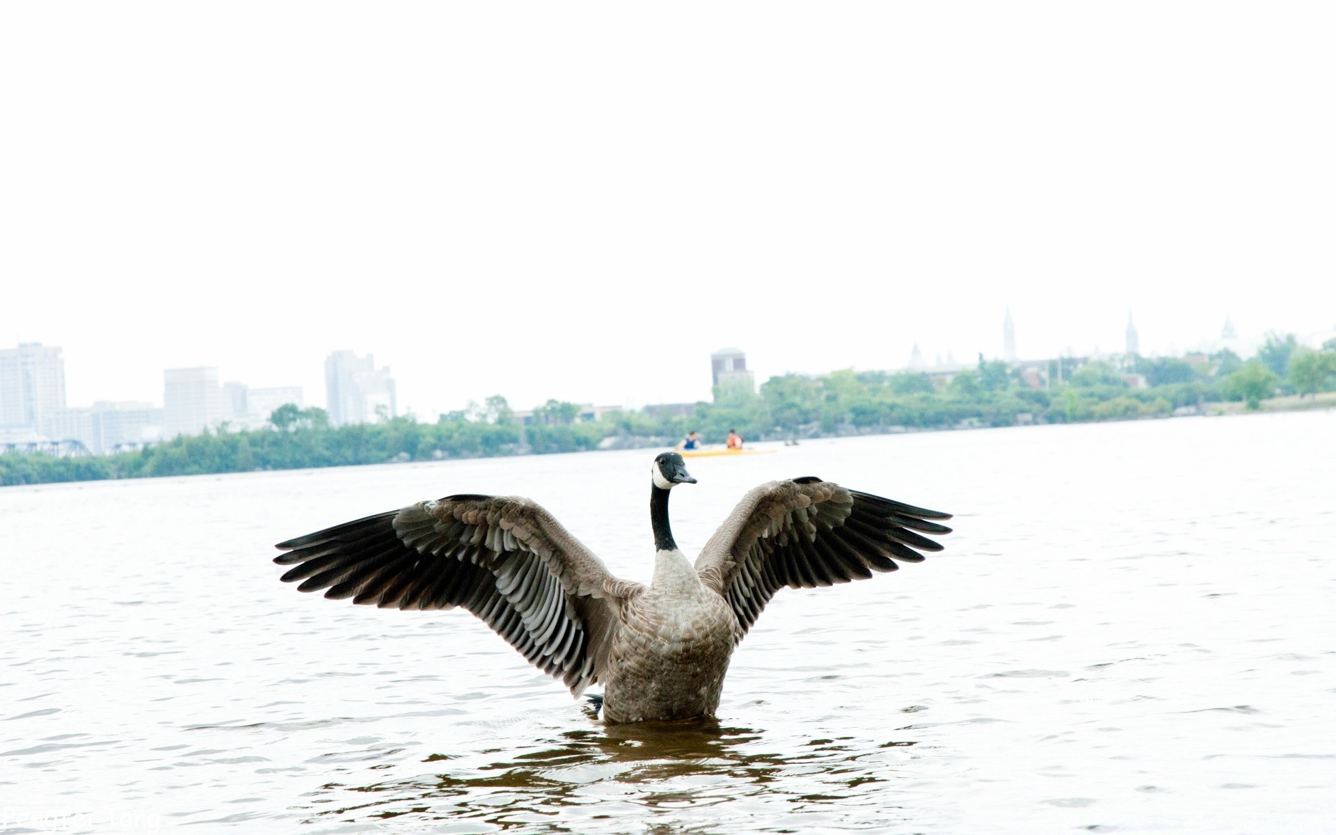 Anatra sul lago allarga le ali