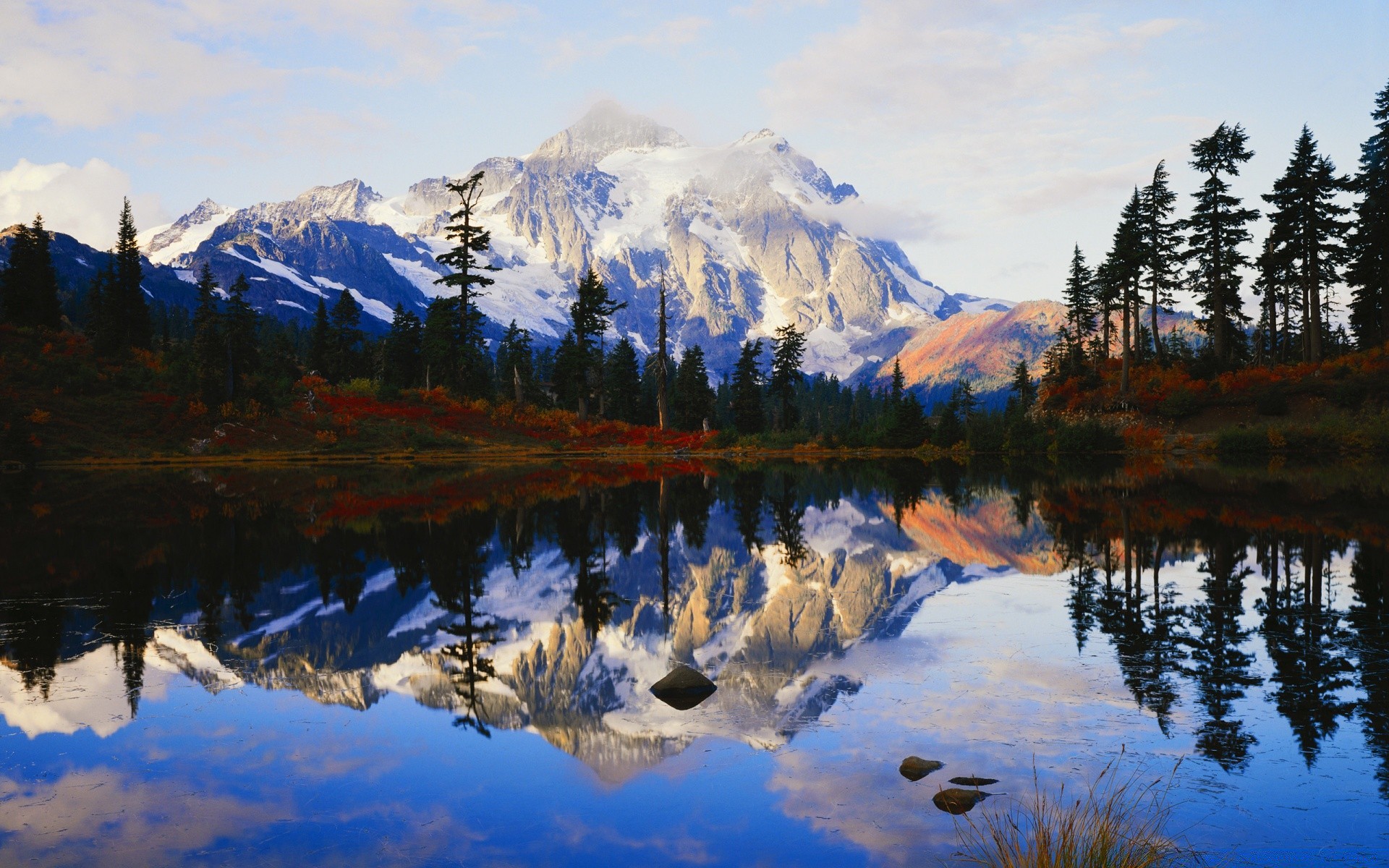 Le montagne innevate si riflettono nel lago