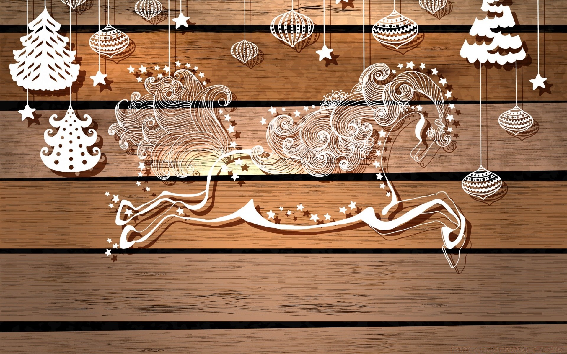 Un cervo di legno con un fiocco e un paio di ciondoli a stella natalizia cuciti in tessuto