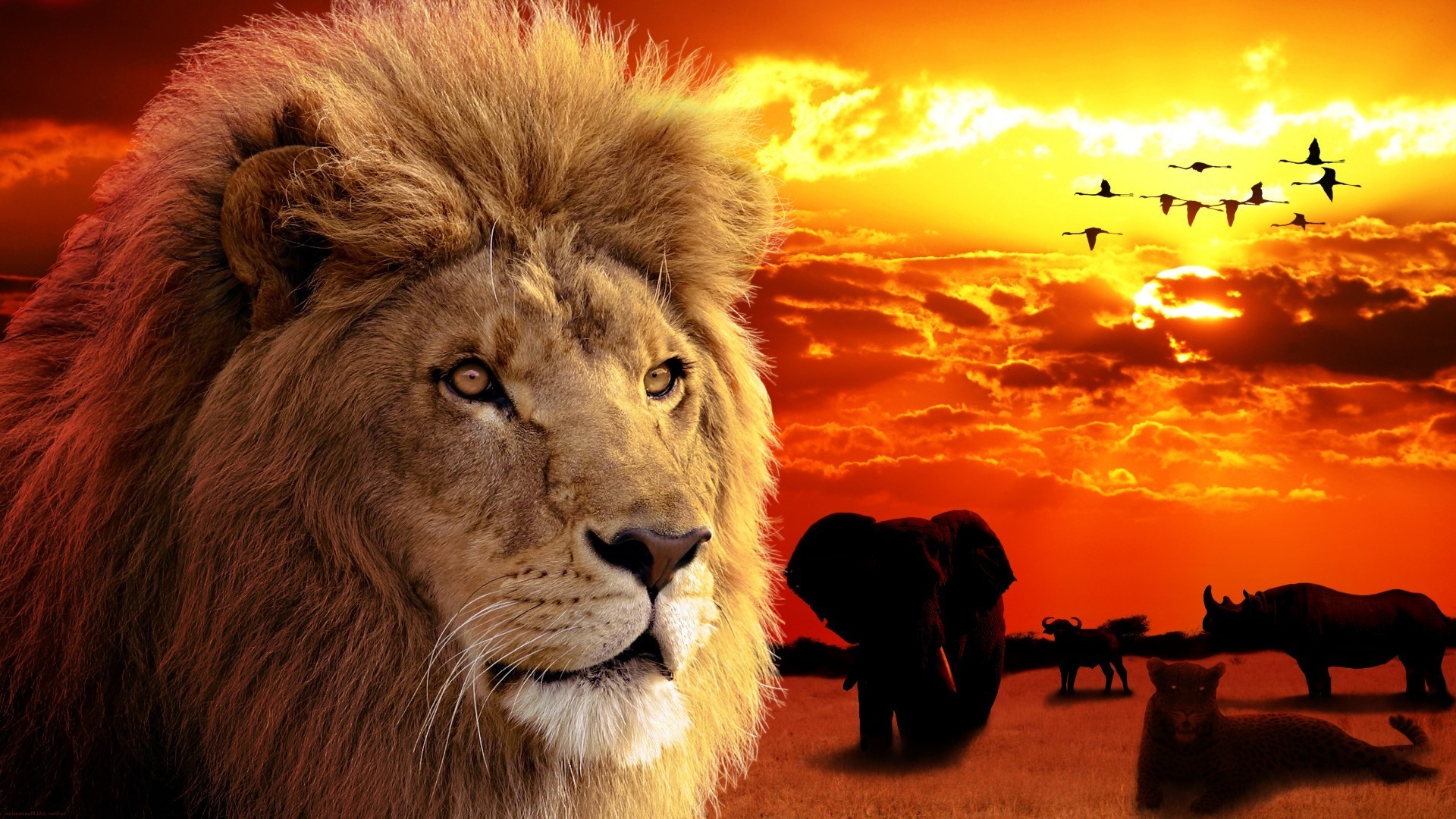 Leone orgoglioso sullo sfondo di elefanti e rinoceronti