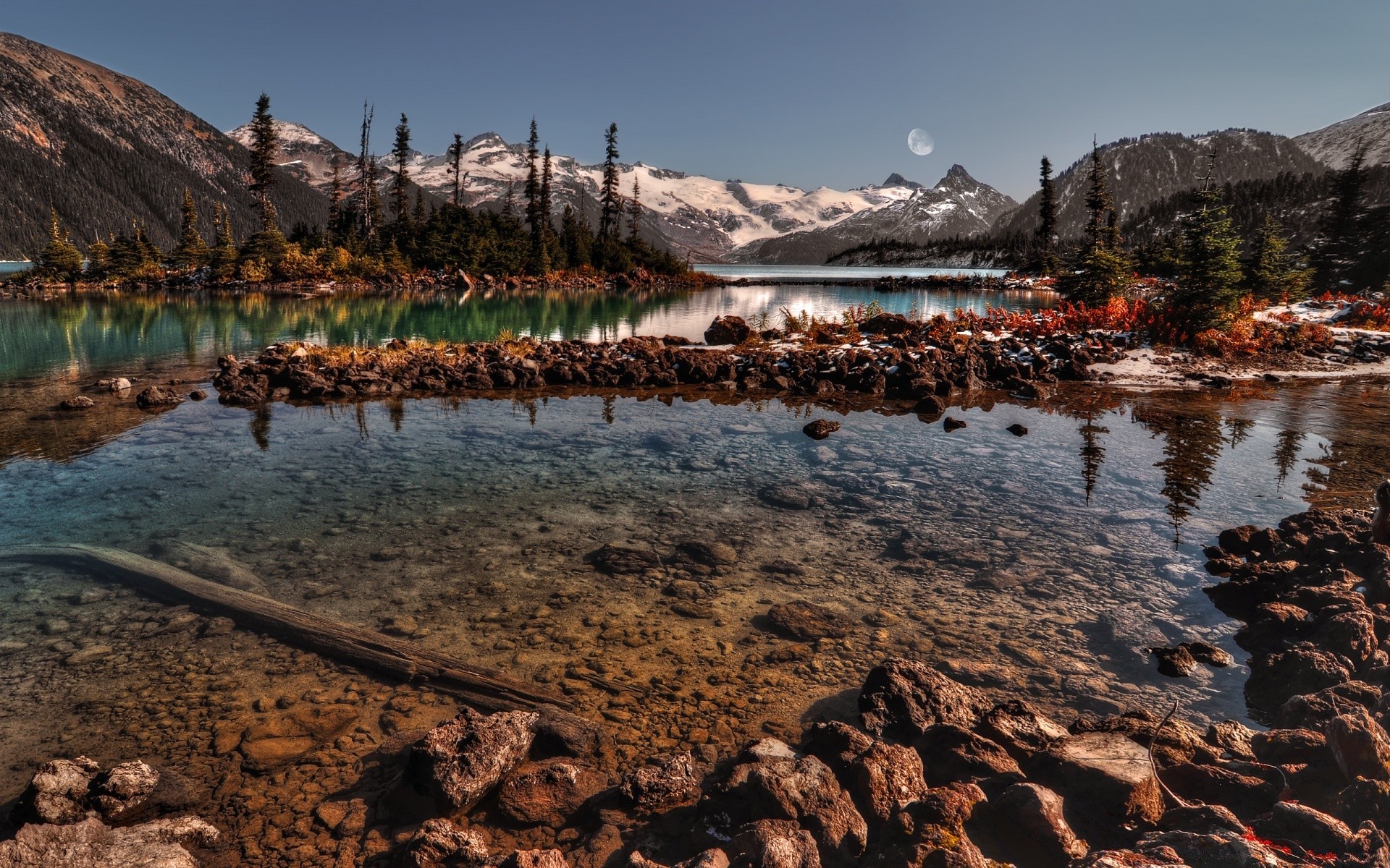 Paesaggio autunnale dello stagno sullo sfondo delle montagne