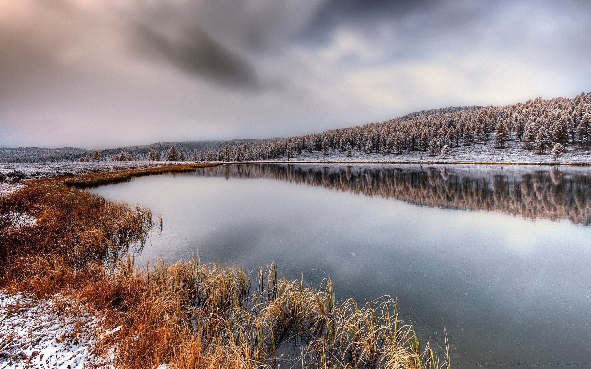Superficie liscia del Lago sullo sfondo di una foresta innevata