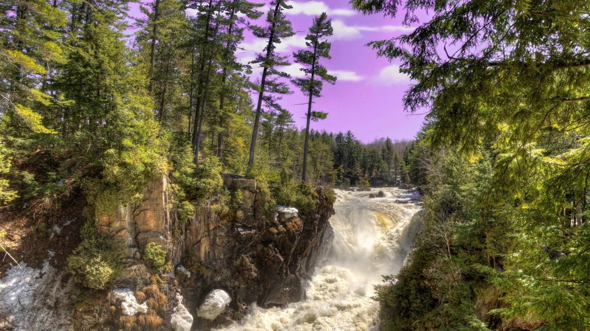 Insolito bellissimo paesaggio di montagne e fogliame nei toni del viola
