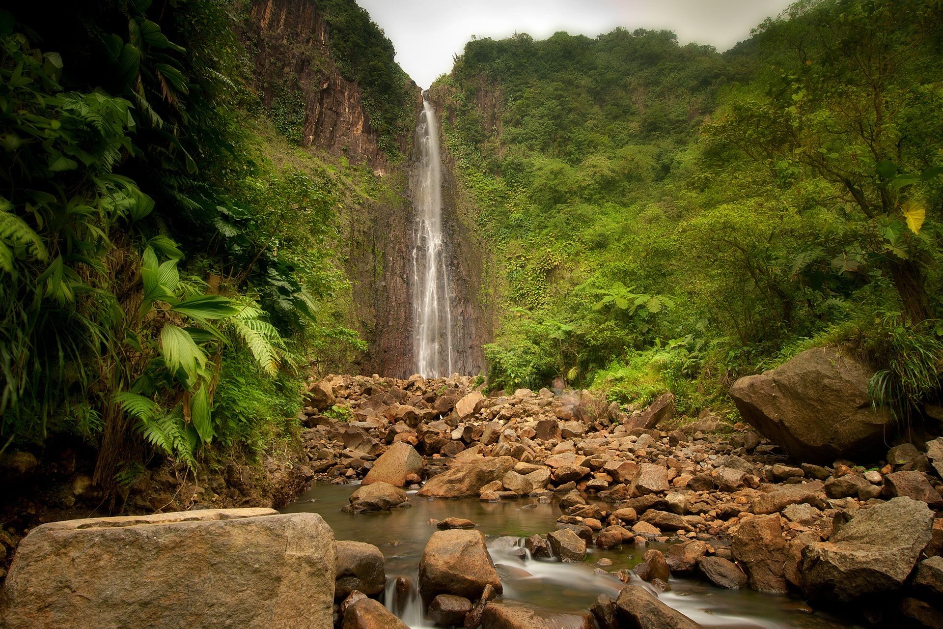 Bella cascata alta nella foresta