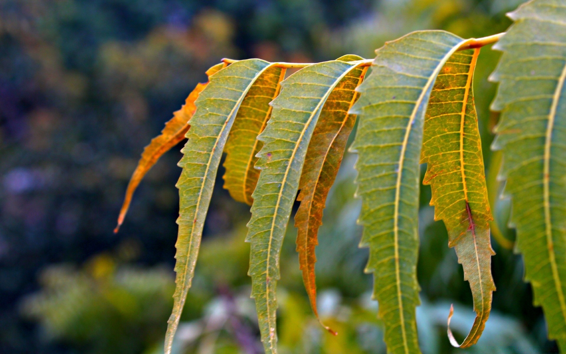 Foglia d'acero secca su un ramo di un albero su sfondo sfocato