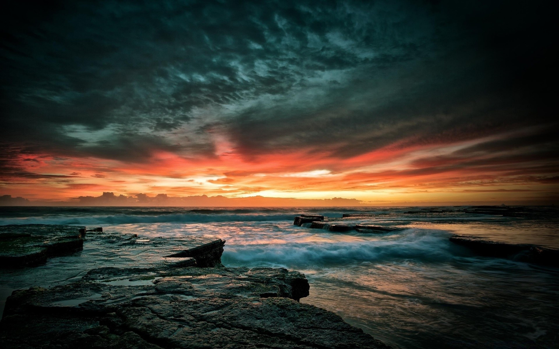 Onde sulla costa rocciosa al tramonto con cielo nuvolosoOnde sulla costa rocciosa al tramonto con cielo nuvoloso