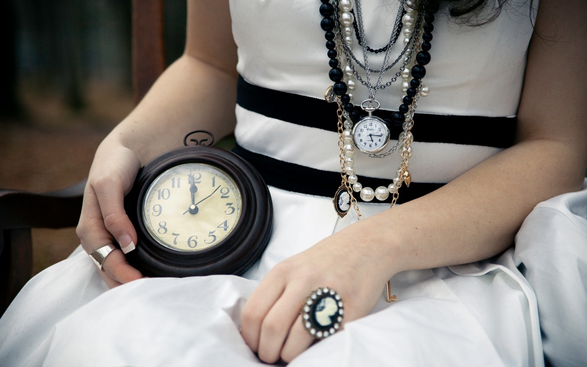 Donna adulta in abito bianco con orologio in ginocchio
