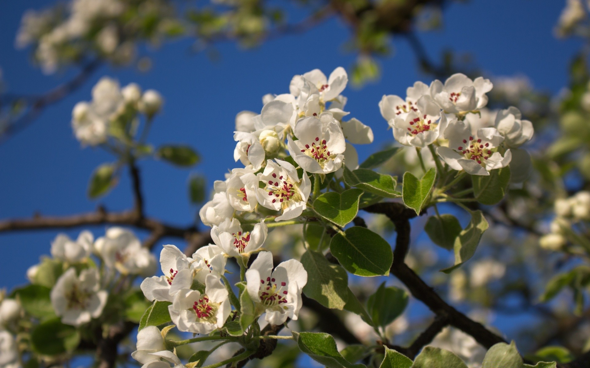 Rami di melo in fiore con una piccola ape su uno dei fiori