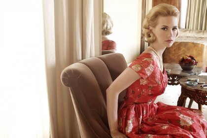 Donna adulta in abito rosso in camera si siede sulla mobilia