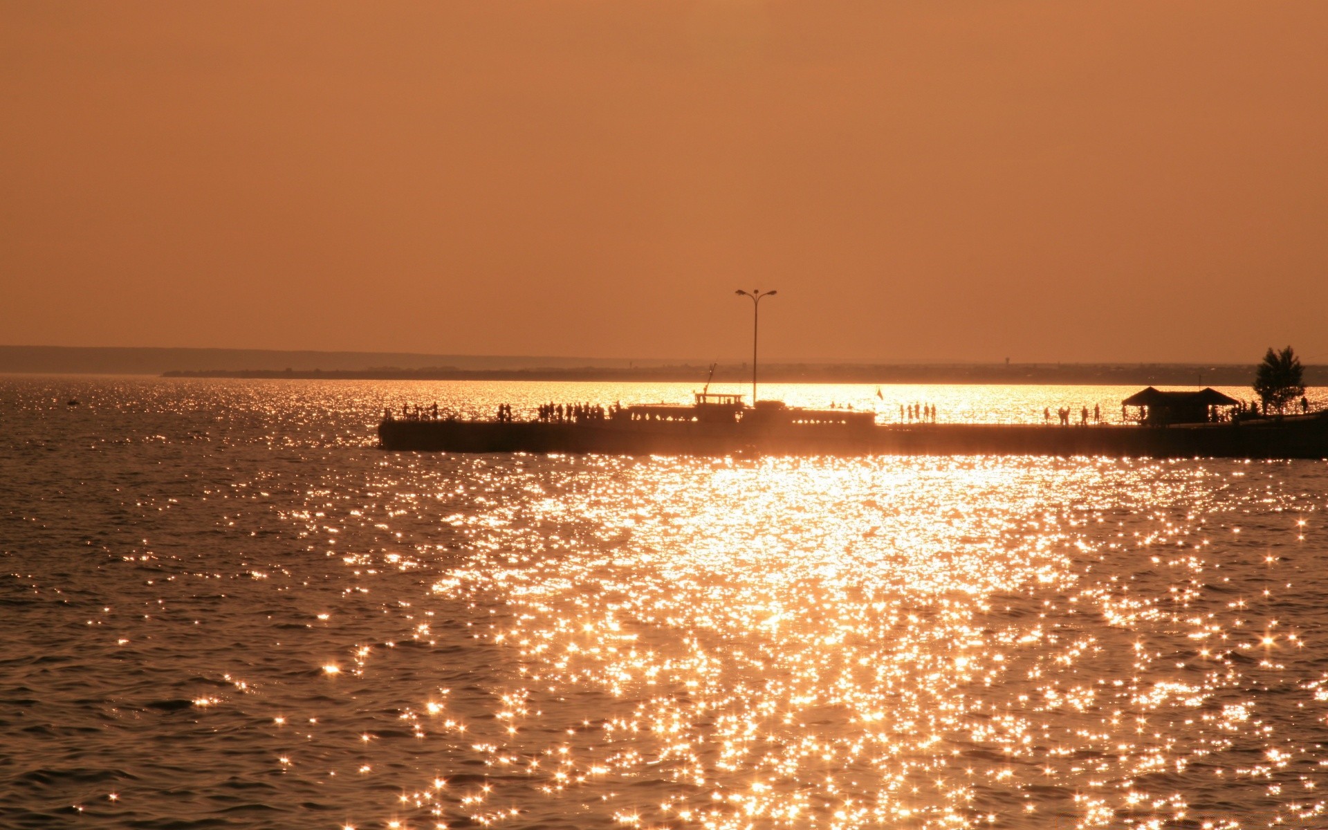 Tramonto vicino al mare nei toni dell'arancio, molo