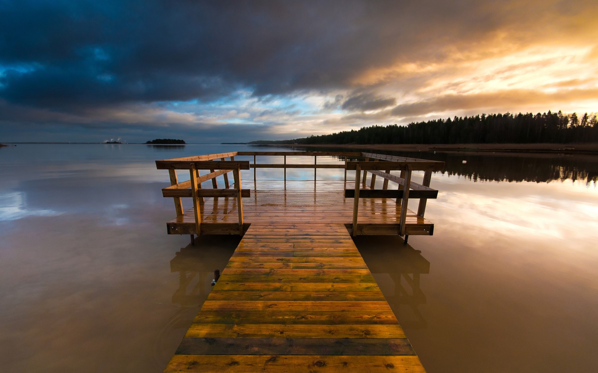 Ponte sul lago tranquillo, riflesso degli alberi in acque calme