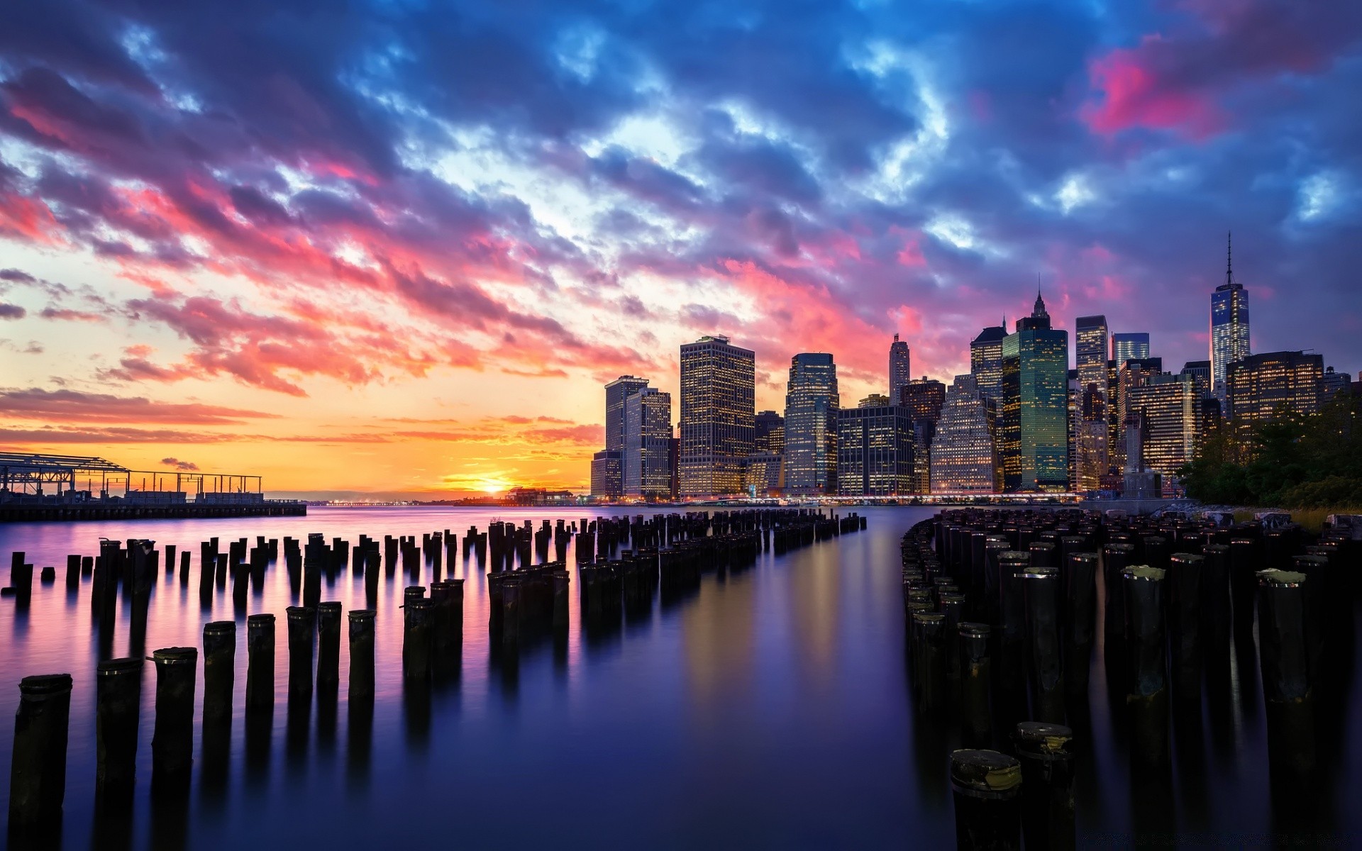 Un fiume nel mezzo di un parco cittadino su uno sfondo di grattacieli