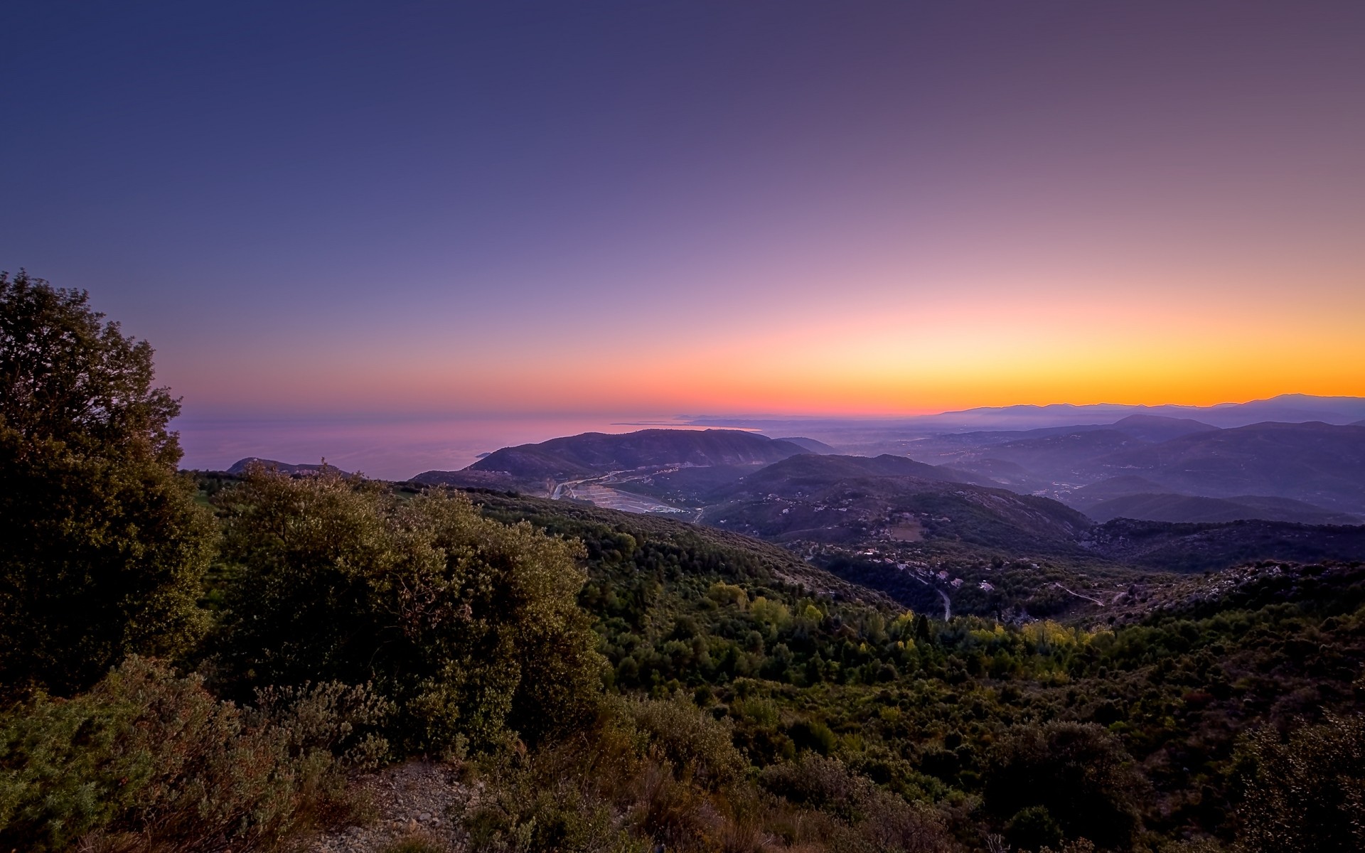Alberi di Natale in fila. C'è nebbia. Montagna