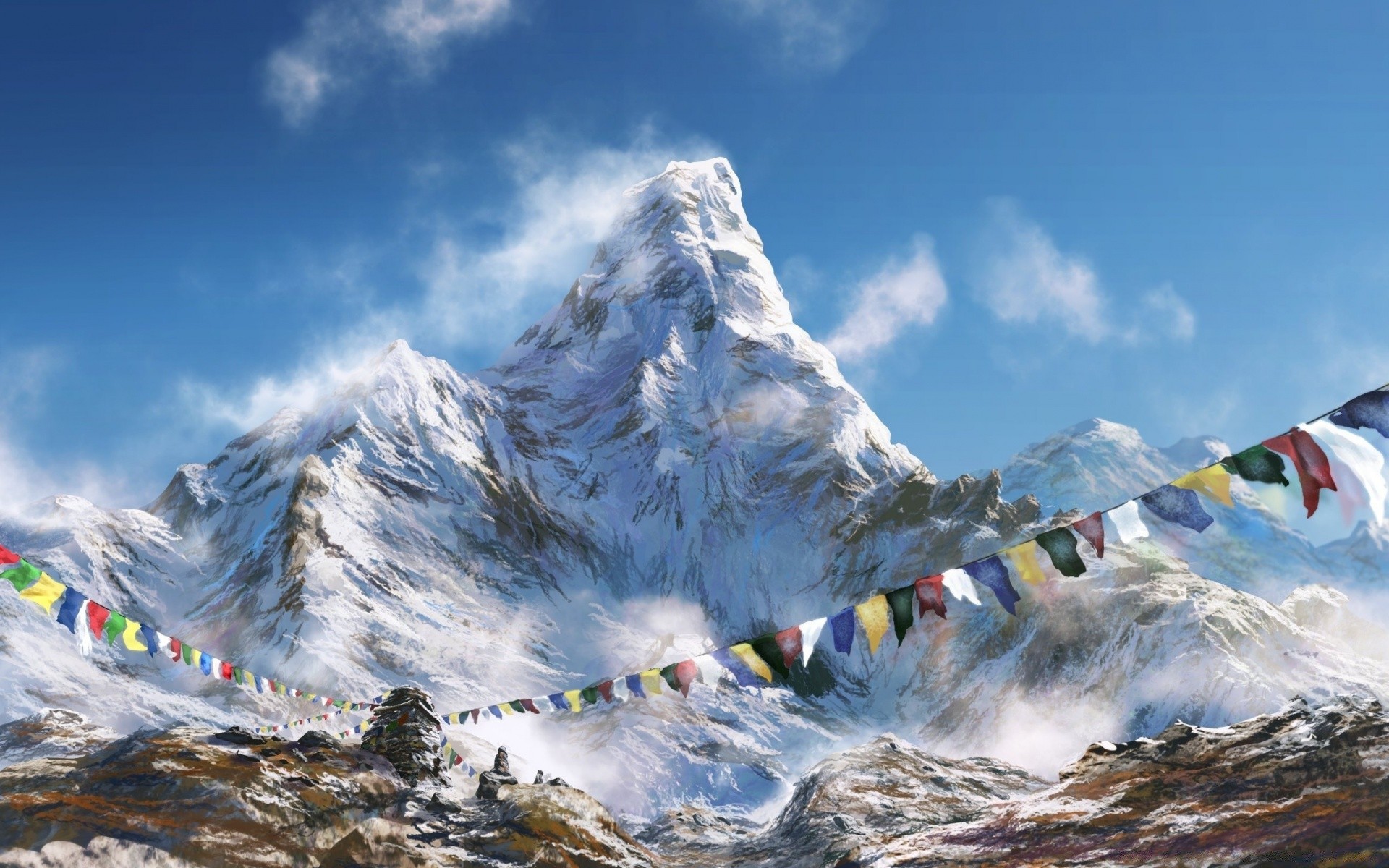 Paesaggio verde e bianco-neve, montagne e nuvole