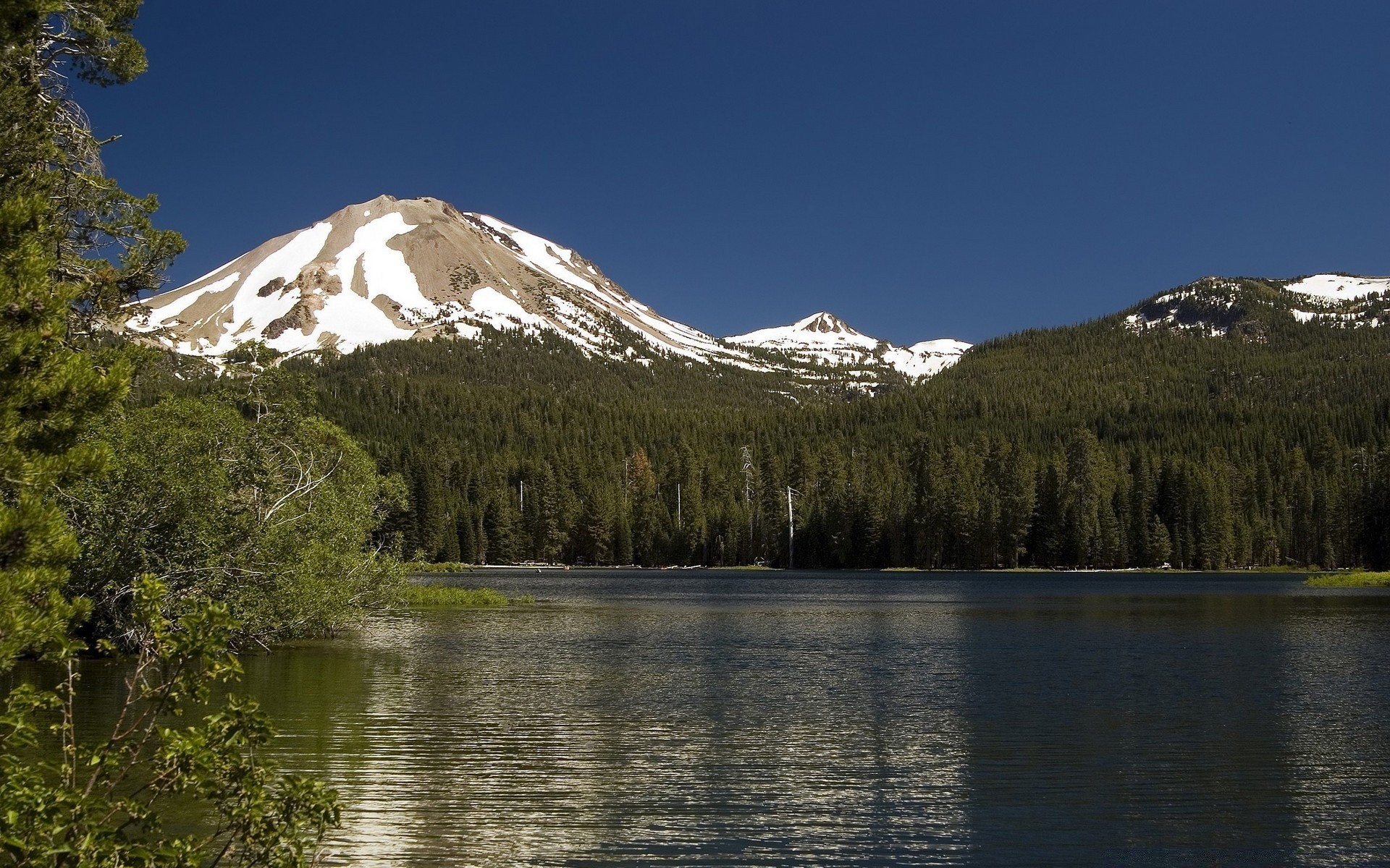 Riflessione della foresta e delle montagne nella superficie del Lago