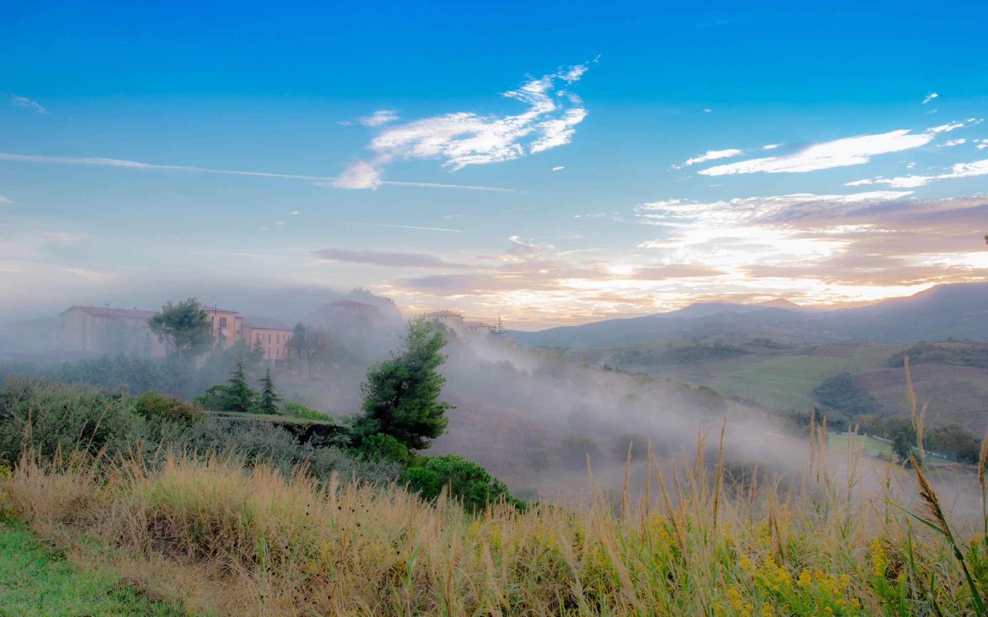 Auto Ferrari che corre lungo l'autostrada lungo una fila di cipressi