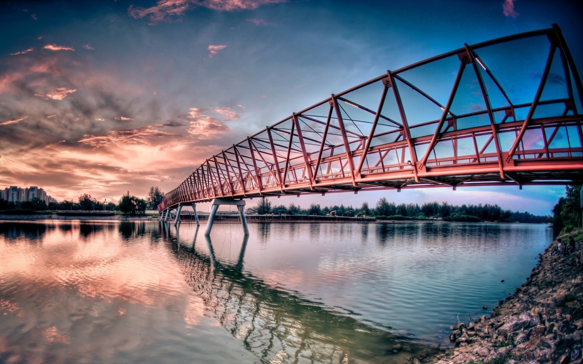 Ponte che conduce alla città ai raggi del sole al tramonto