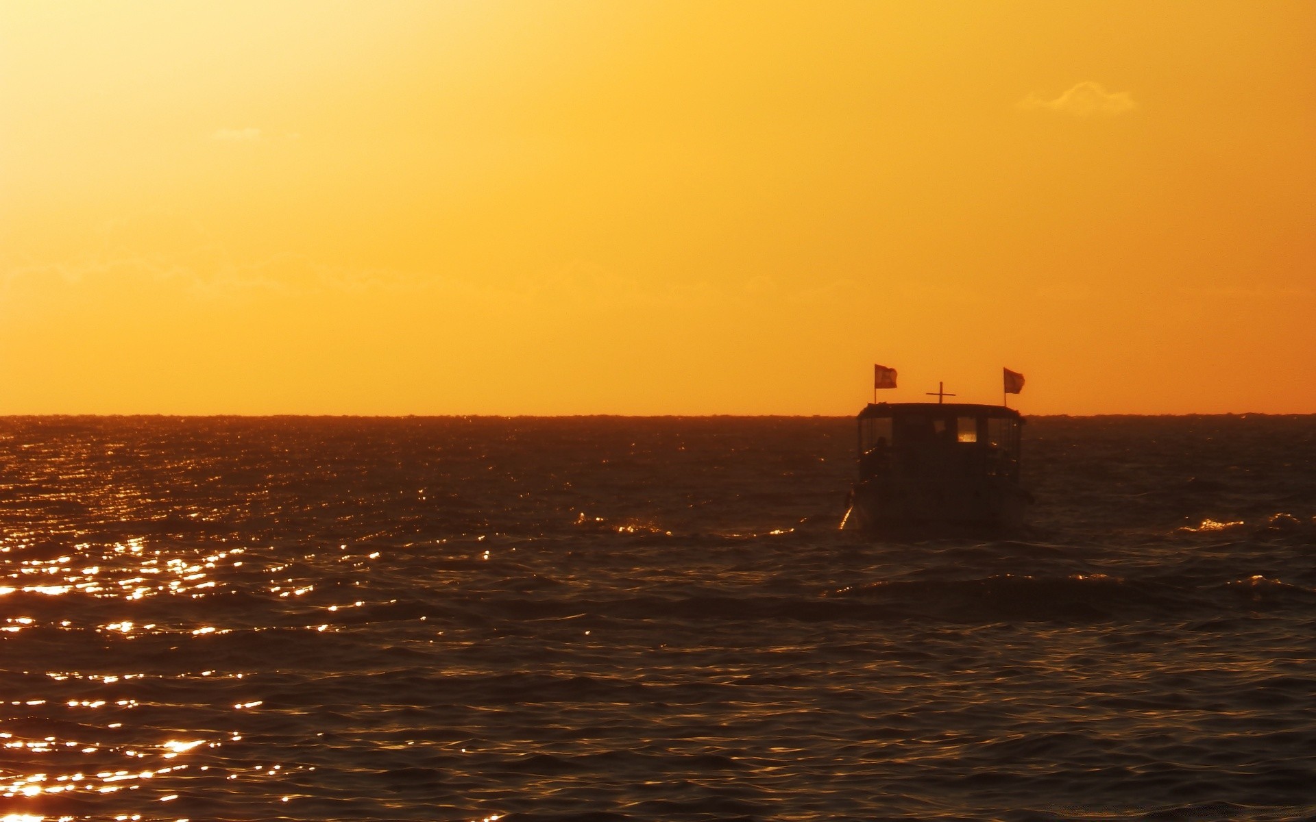 Tramonto vicino al mare nei toni dell'arancio, molo