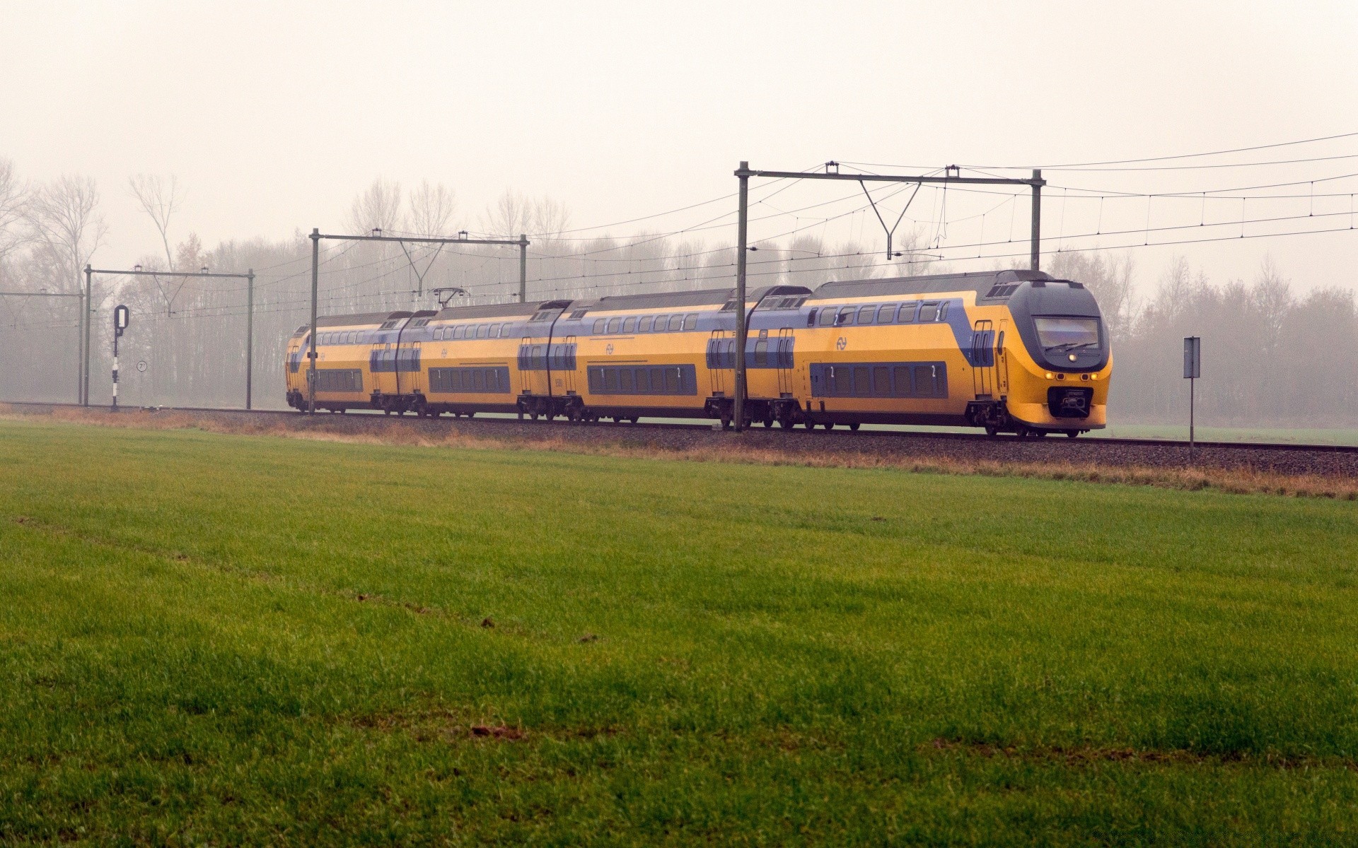 TRENO ELETTRICO NELLA NEBBIA SULLO SFONDO DEL PRATO NELLA NEBBIA