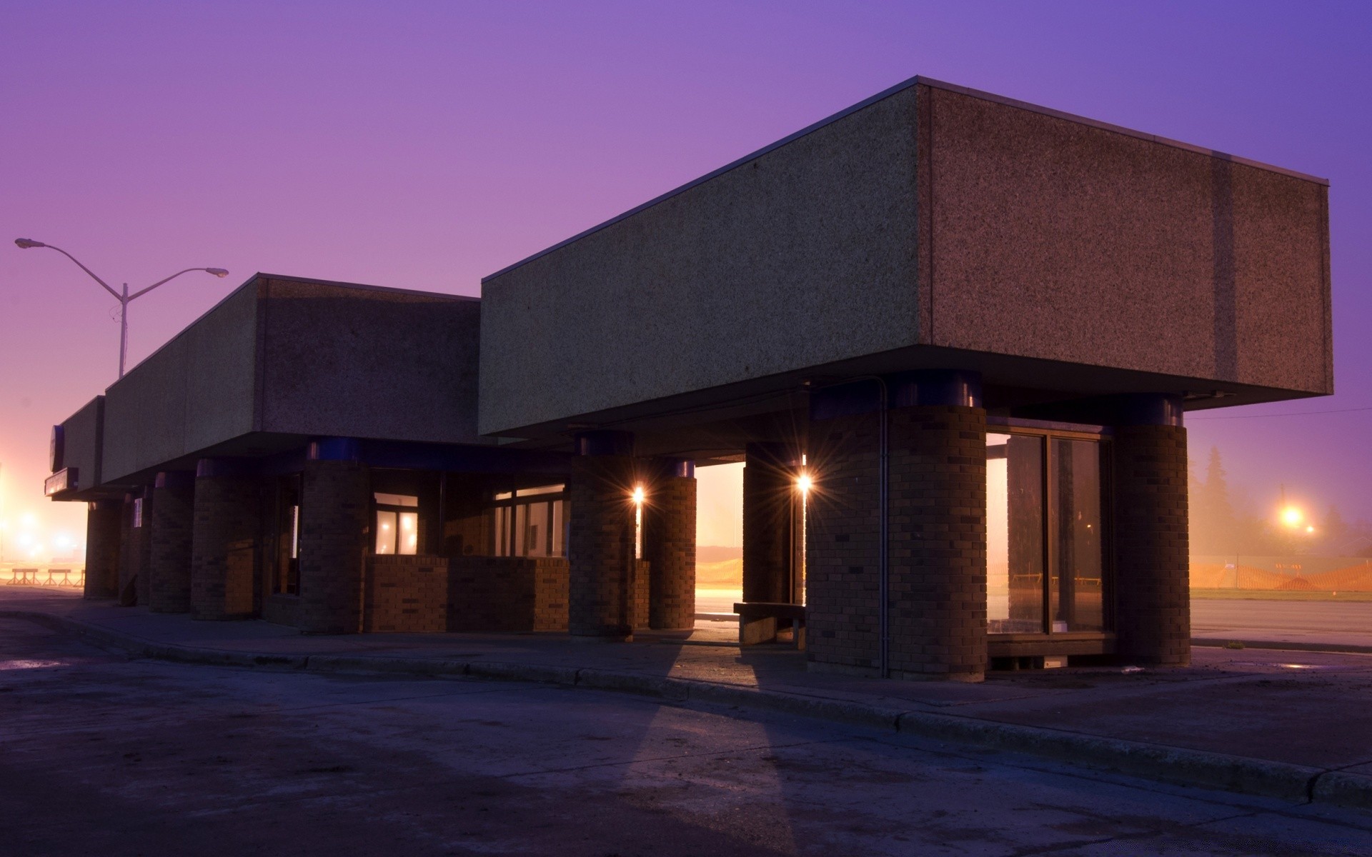 Una casa con una strana architettura contro un cielo viola