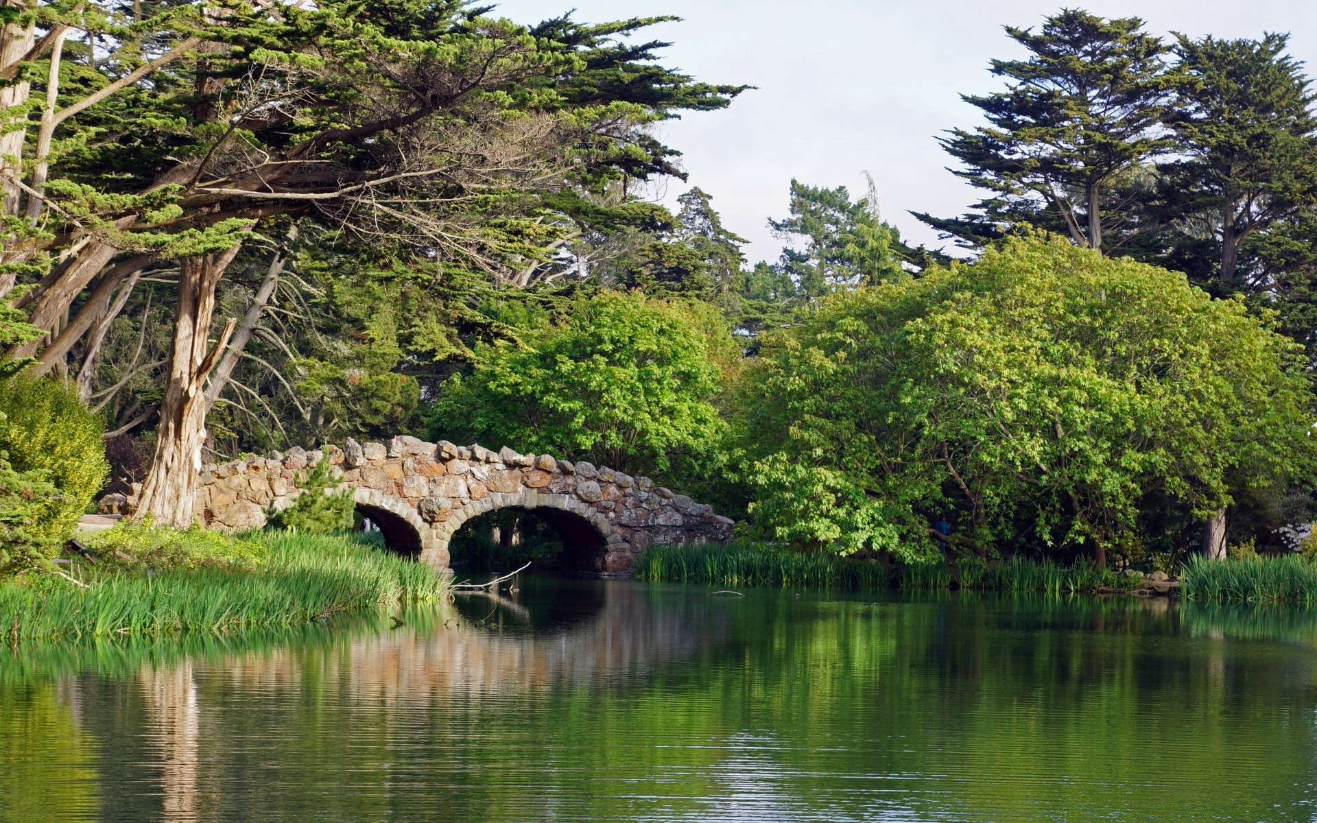 Bella natura con alberi, fiume e Ponte