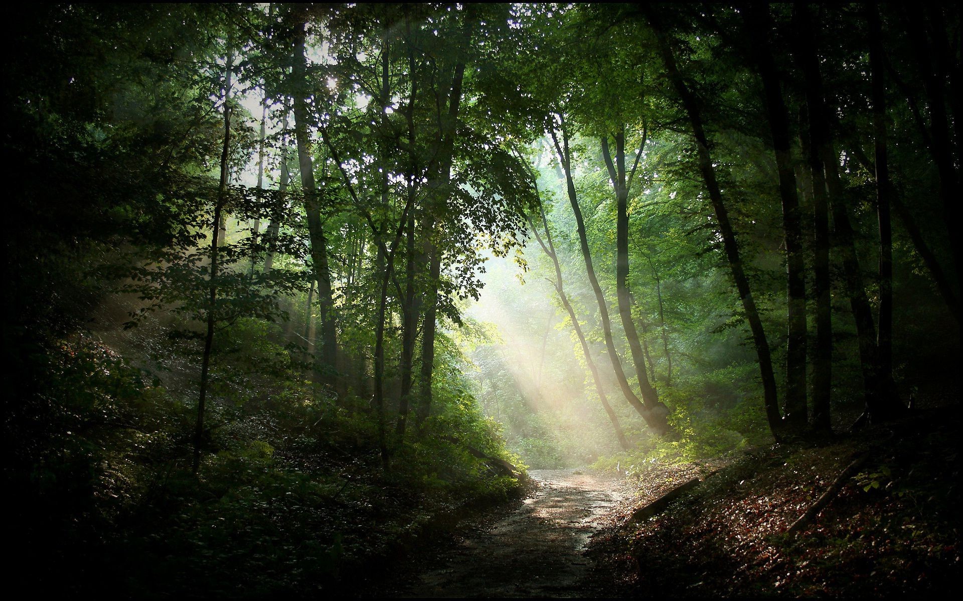 Un misterioso boschetto, raggi di sole attraverso il fogliame