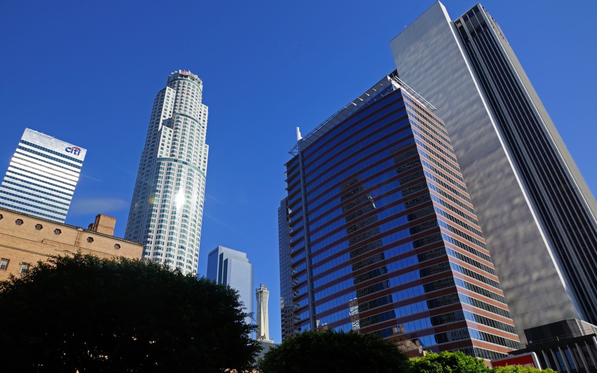 GRATTACIELI DELLA CITTÀ NOTTURNA E FASCIO DI RIFLETTORI