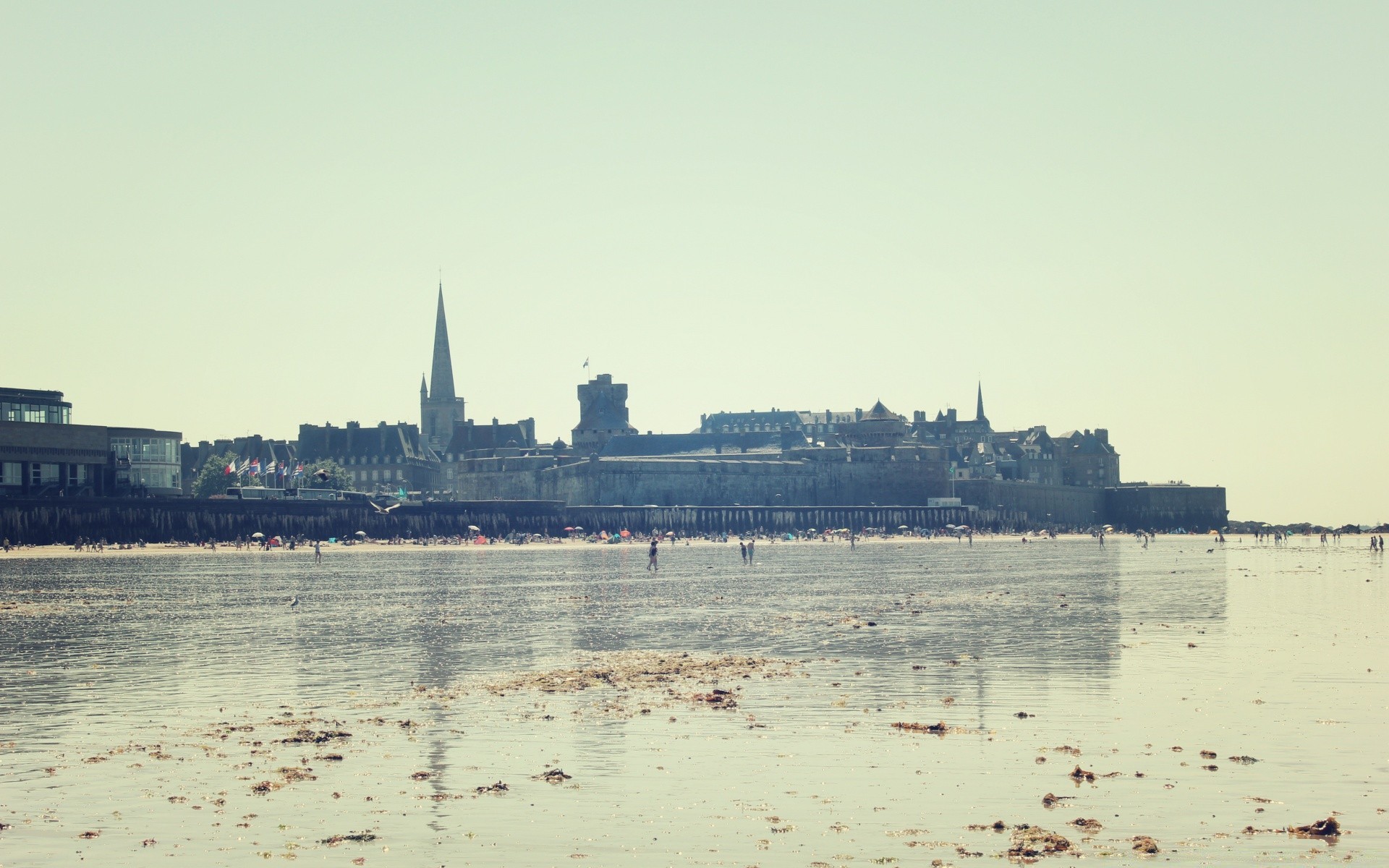 Case alte vicino all'acqua sullo sfondo del tramonto