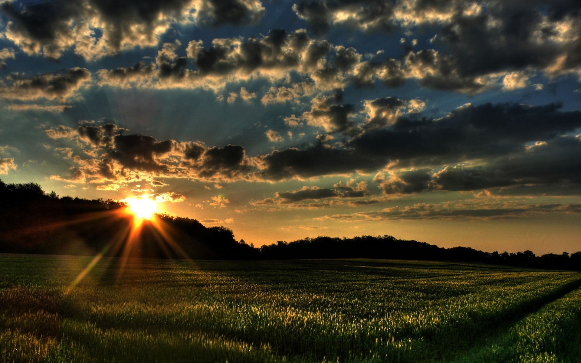 Campo nei raggi luminosi del sole nascente sul cielo nuvoloso