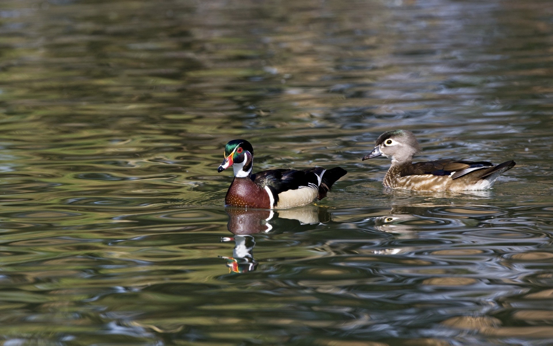 Due Cigni sull'acqua. Cigno con le ali aperte