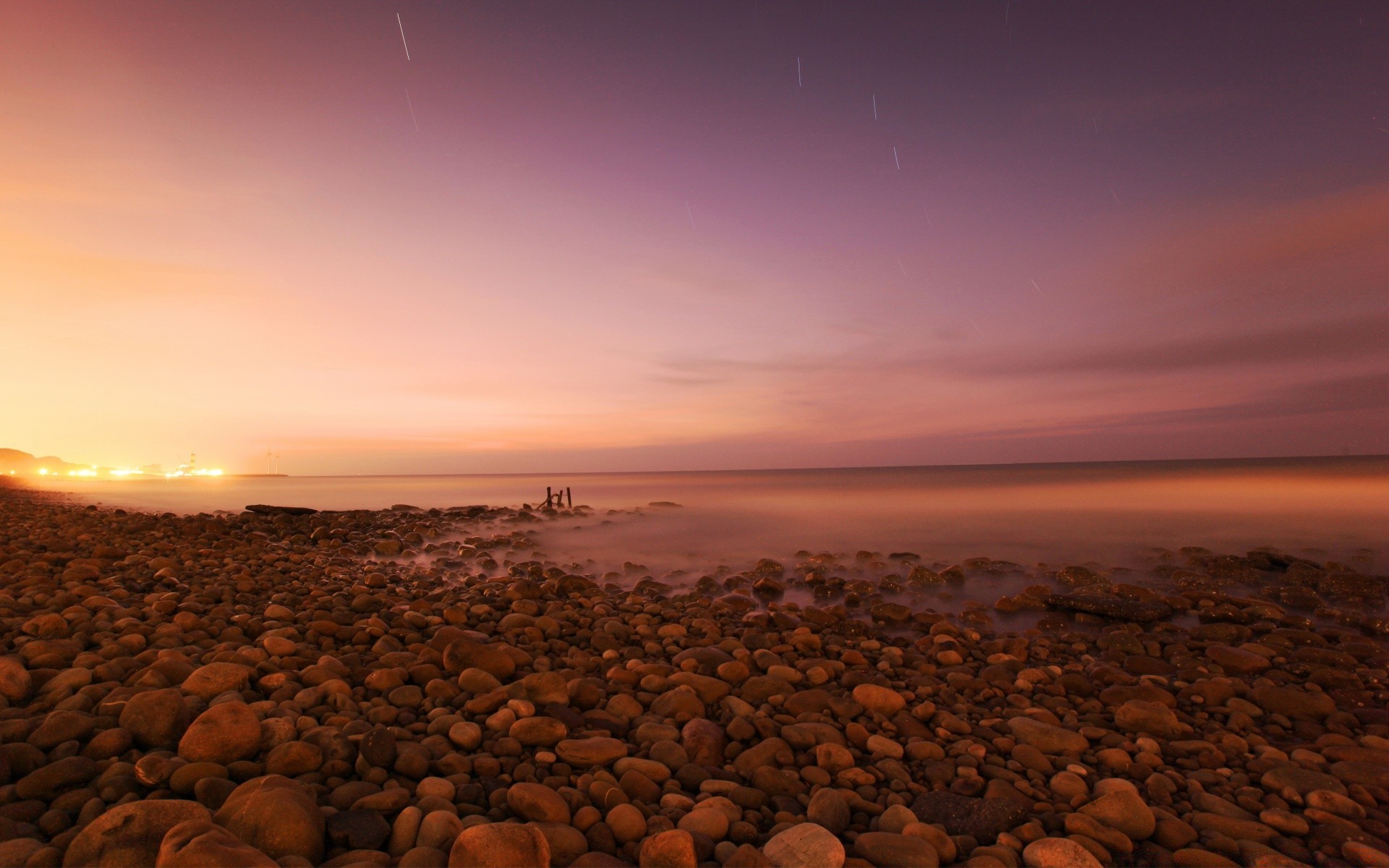 Tramonto vicino all'oceano. spiaggia serale con rocce e ondeTramonto vicino all'oceano. Spiaggia serale con rocce e onde