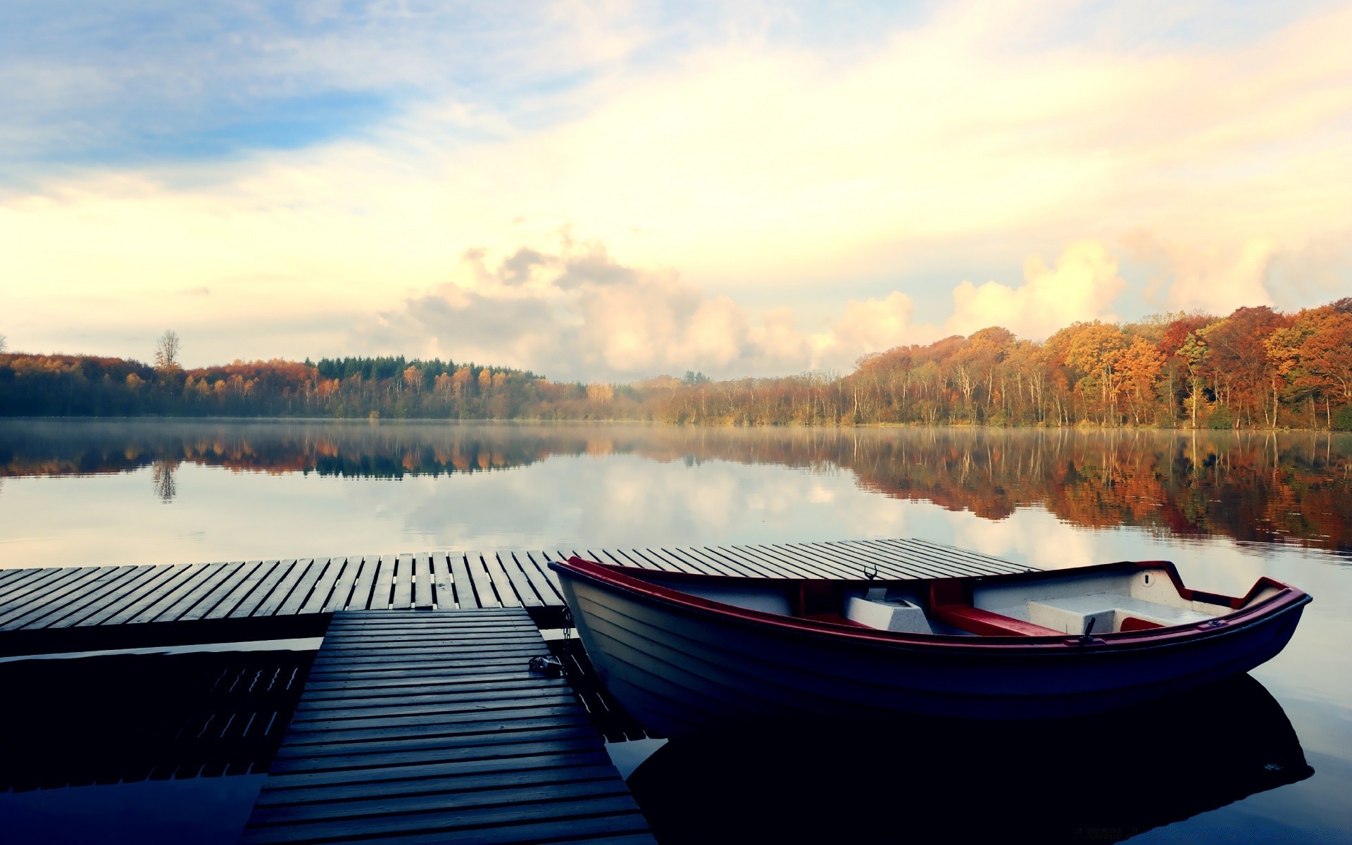 Barca, molo, lago e panorama della foresta