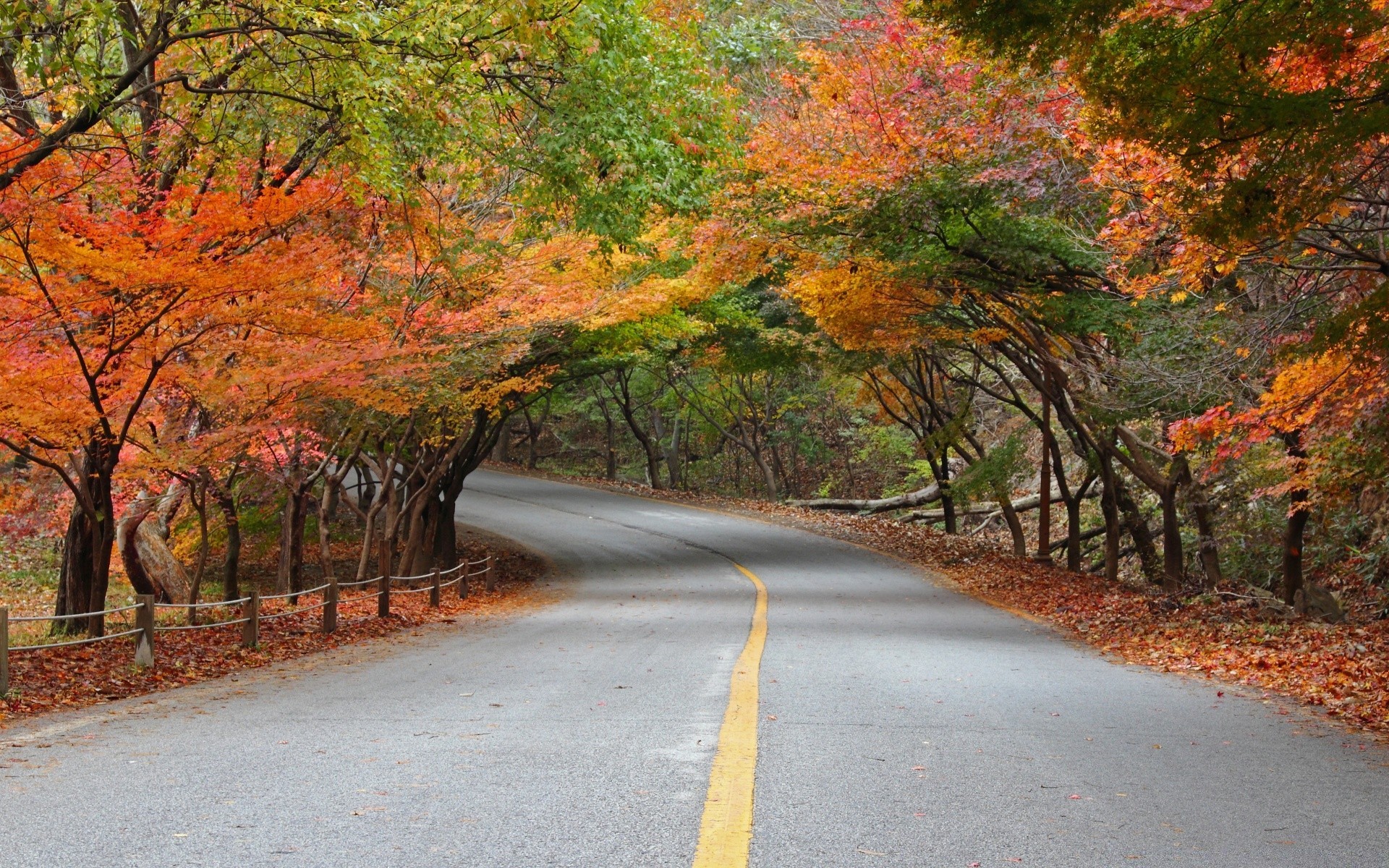 Sentiero nel parco autunnale, fogliame caduto dorato, luce del sole