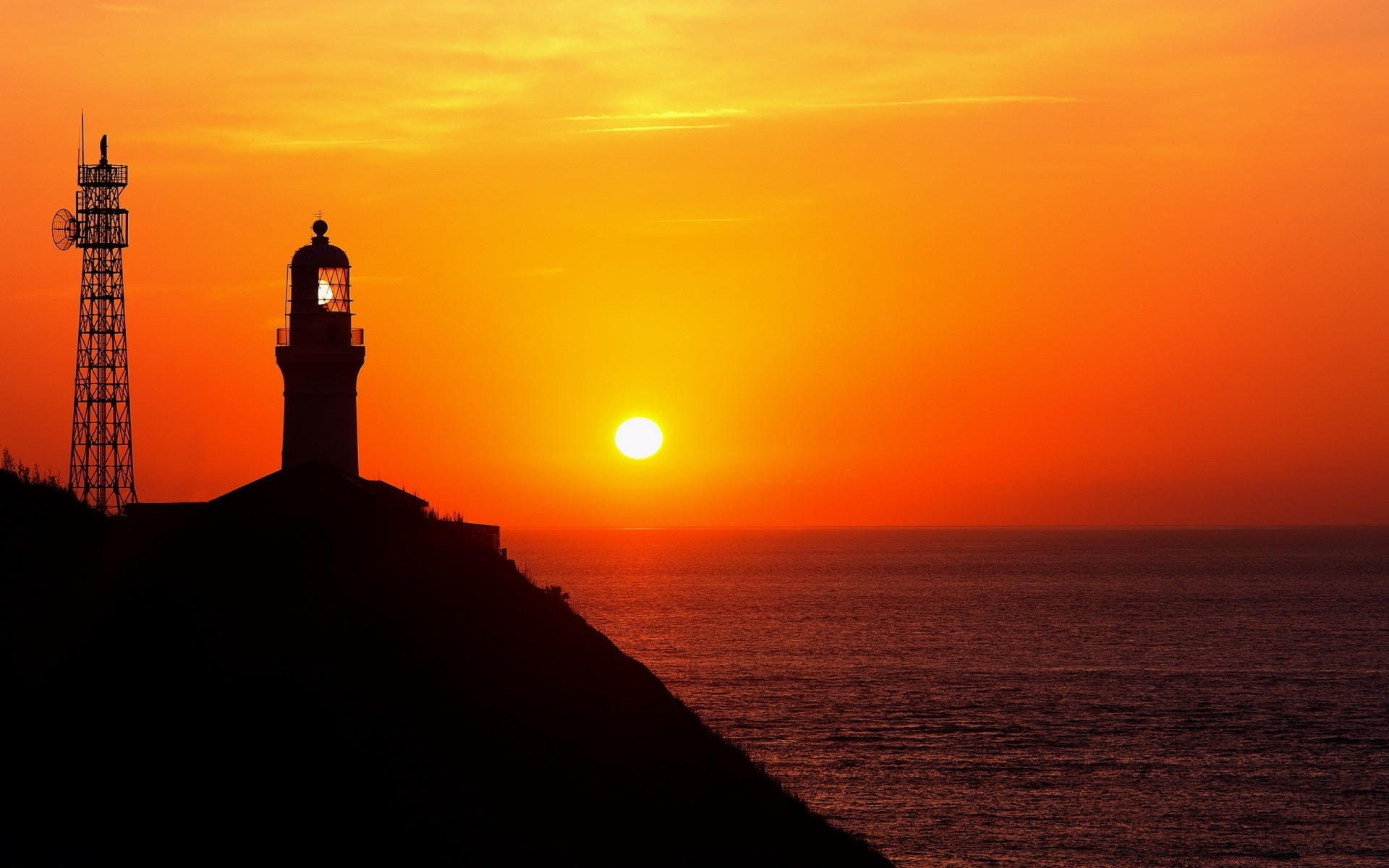 Faro sulla roccia sopra il mare alla luce rossa del sole in partenza