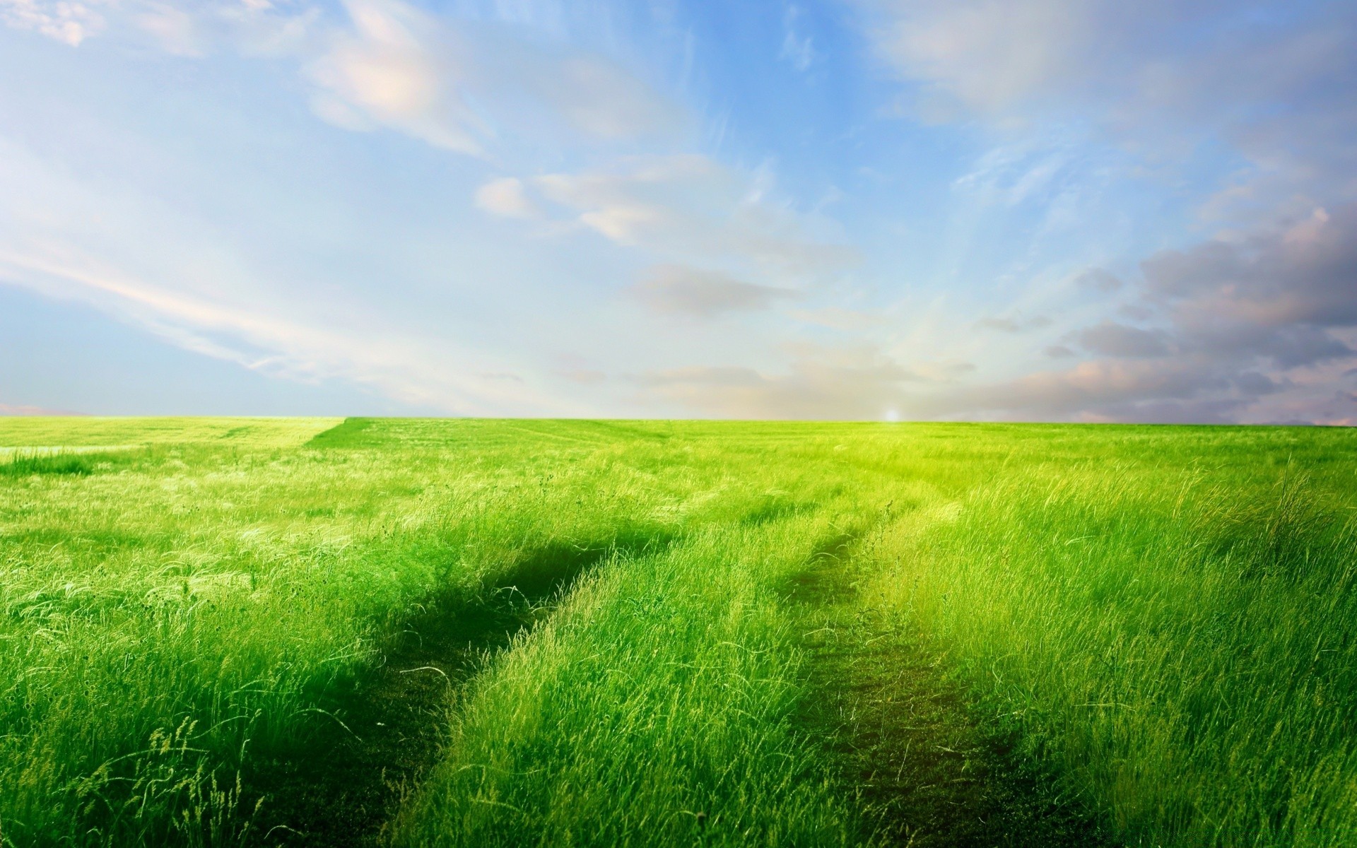 Bellissimo paesaggio. Erba verde chiaro. Cielo sereno