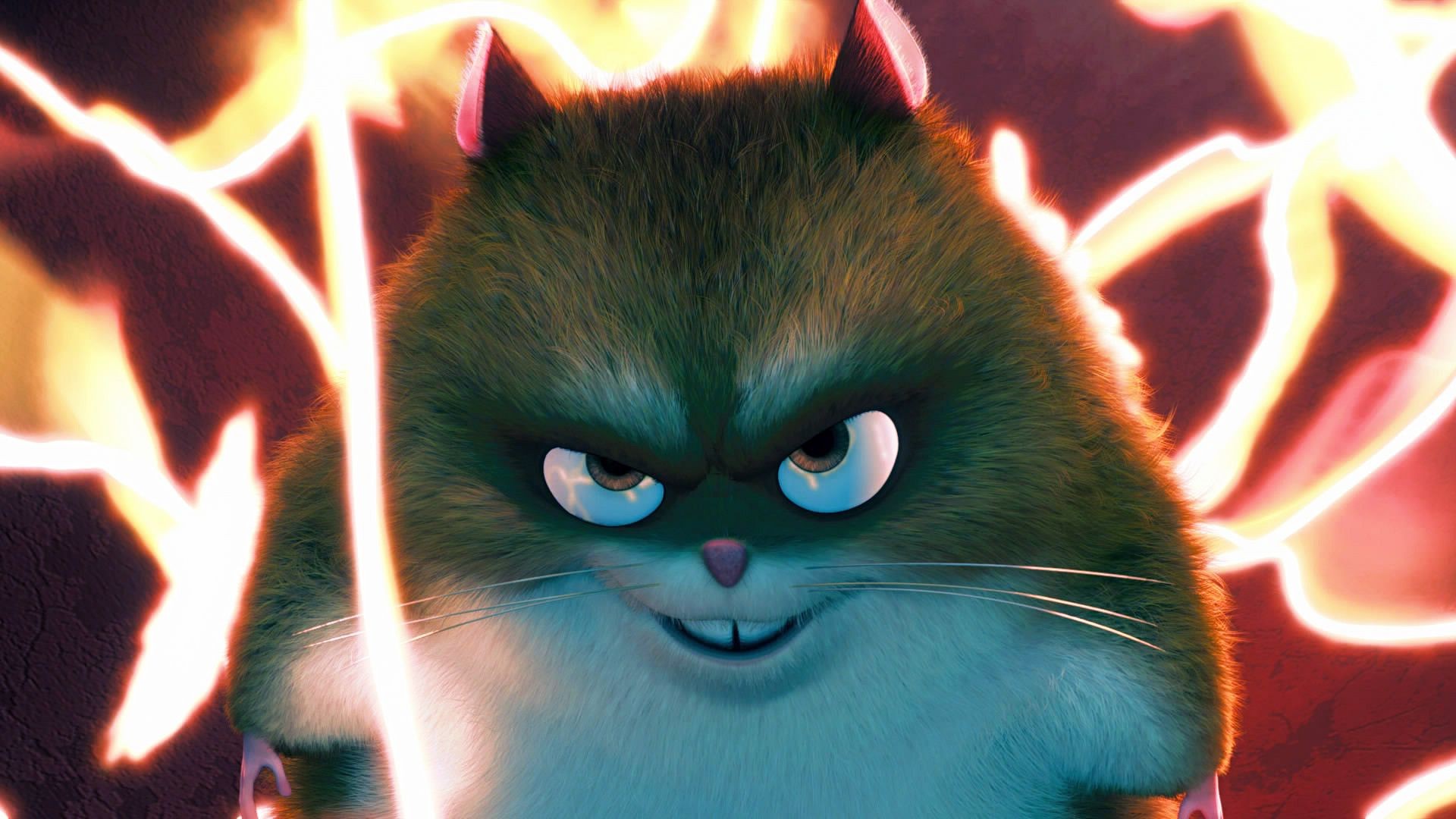 Gatto paffuto su uno sfondo di fiamme con gli occhi malvagi