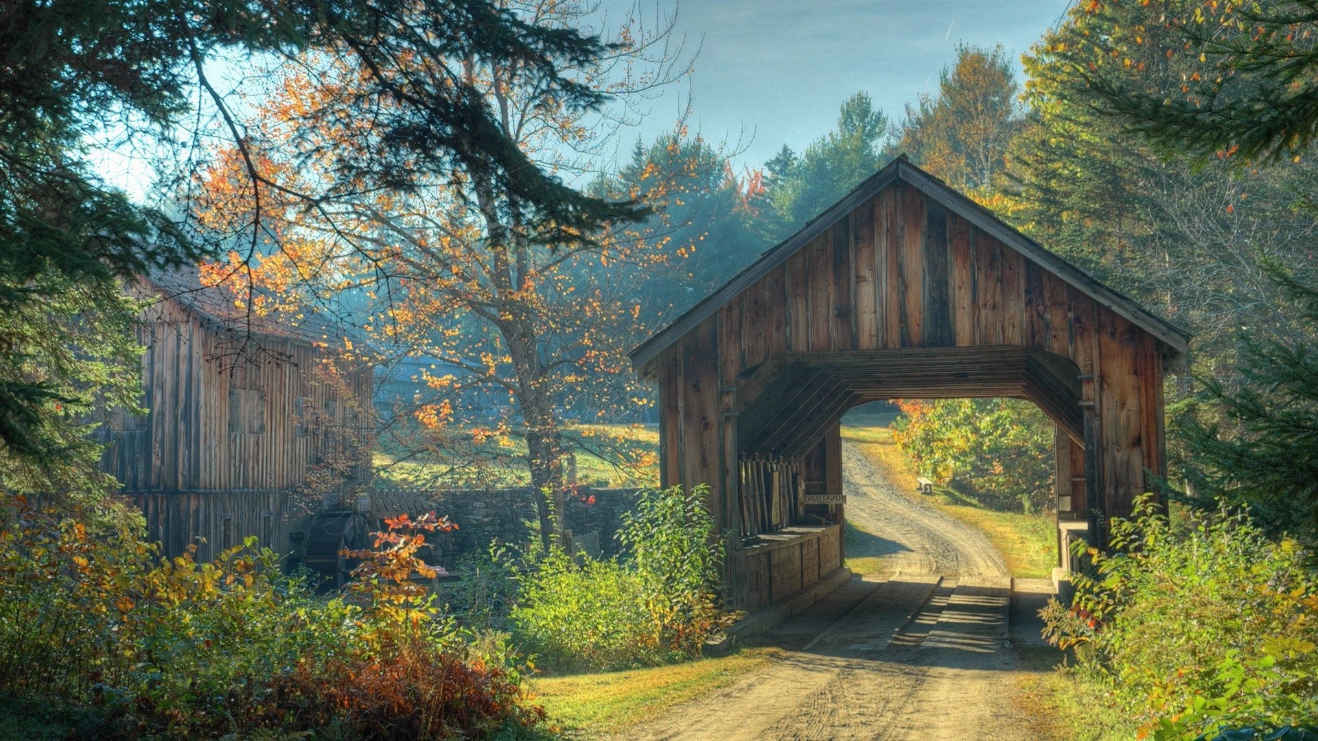 Strada del villaggio che passa attraverso un fienile in legno