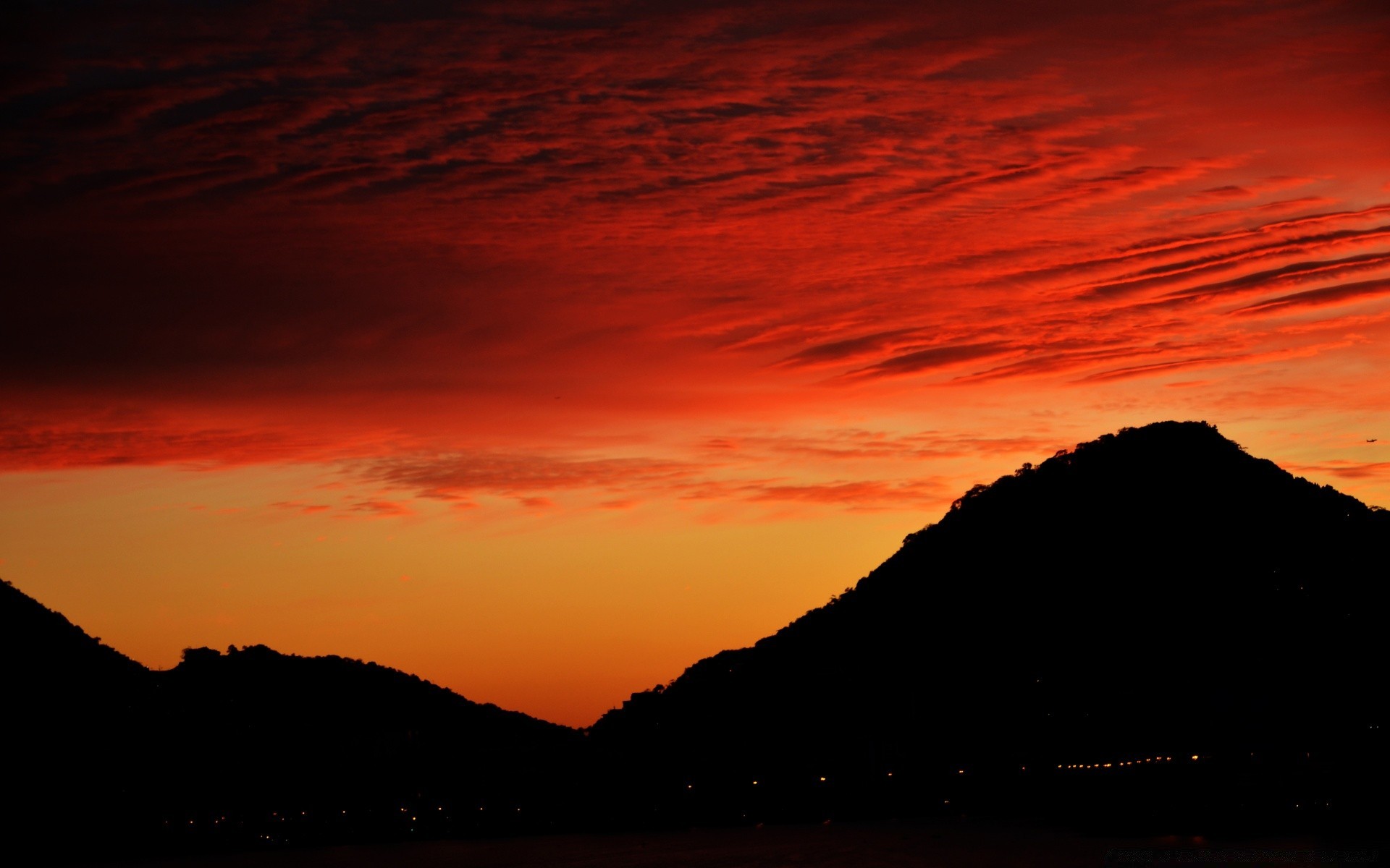 Il tramonto si nasconde dietro i tetti scuri delle case in un luminoso cielo arancione