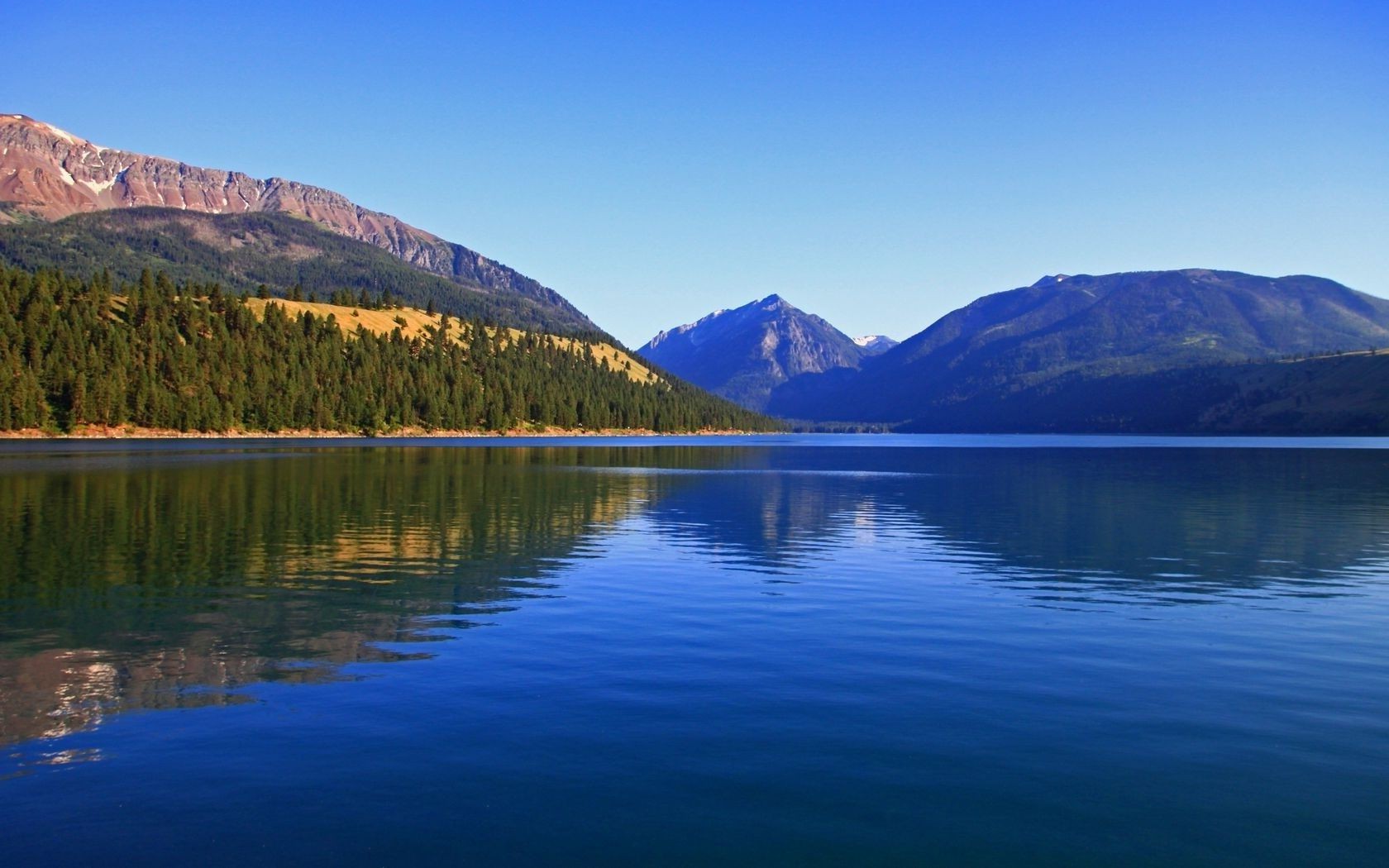 Paesaggio autunnale. Lago di montagna, montagne, cielo blu