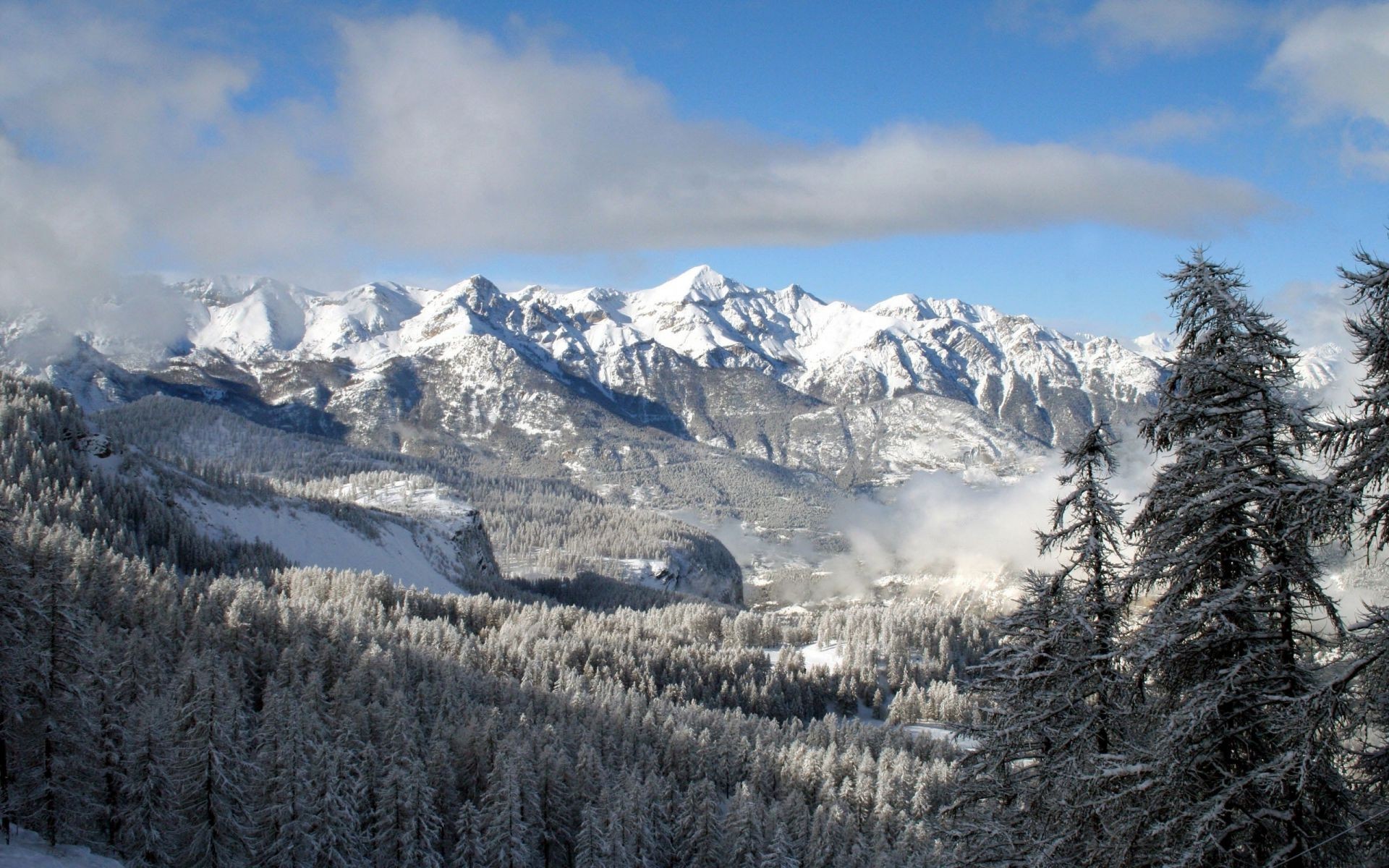 Montagne innevate e foresta invernale