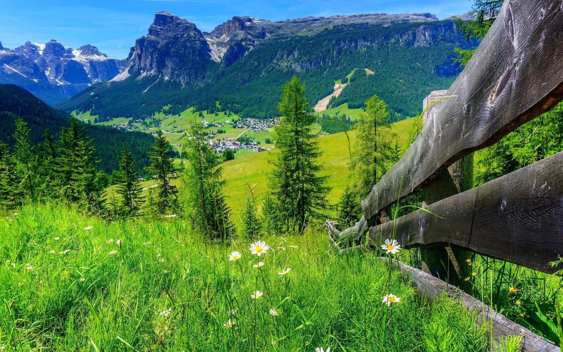 Case in montagne verdi sotto cielo blu aperto con nuvole