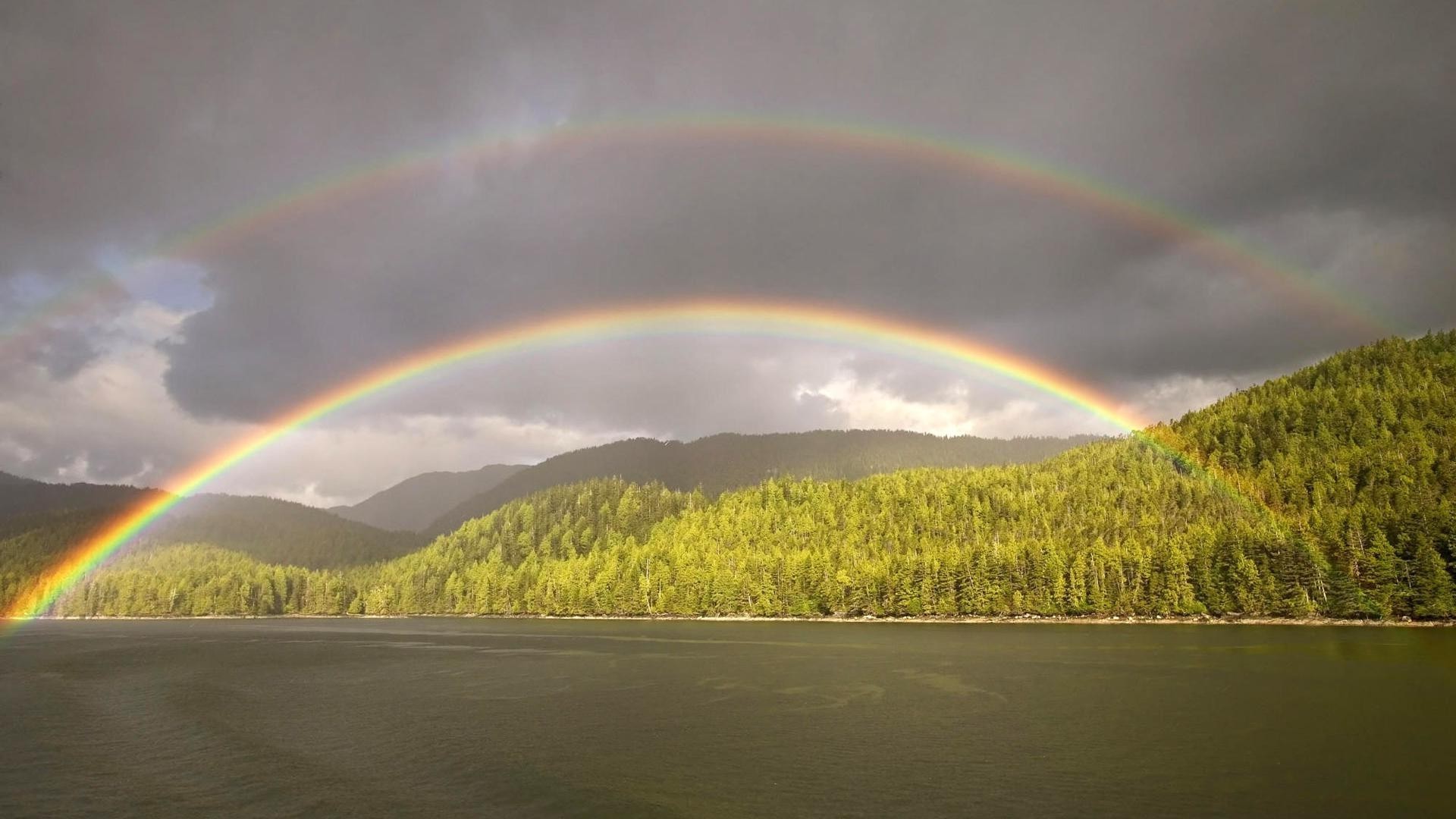 Doppio arcobaleno sul fiume. Coste verdi