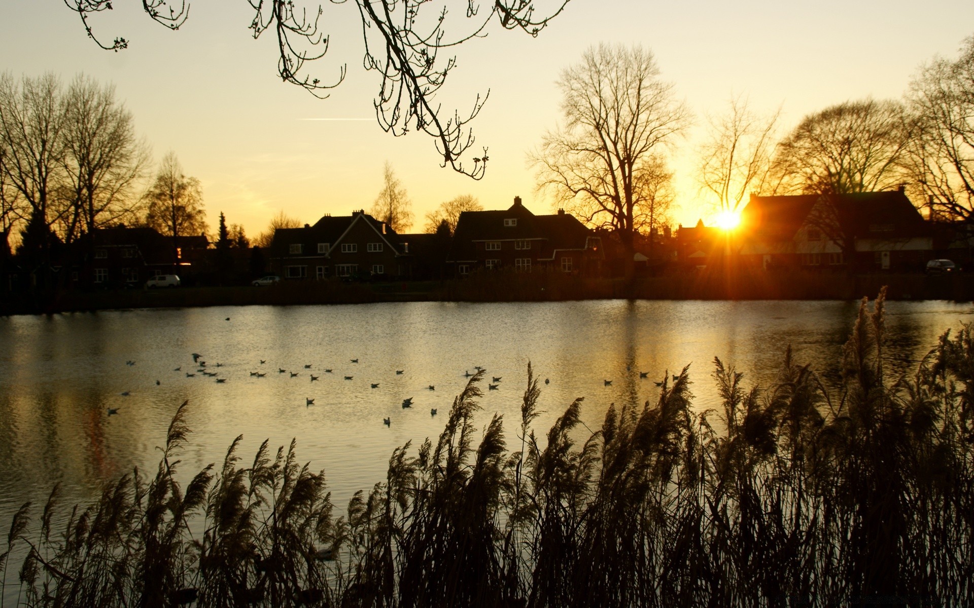 Alberi in abito autunnale che si riflettono nella superficie del lago con tempo chiaro e calmo