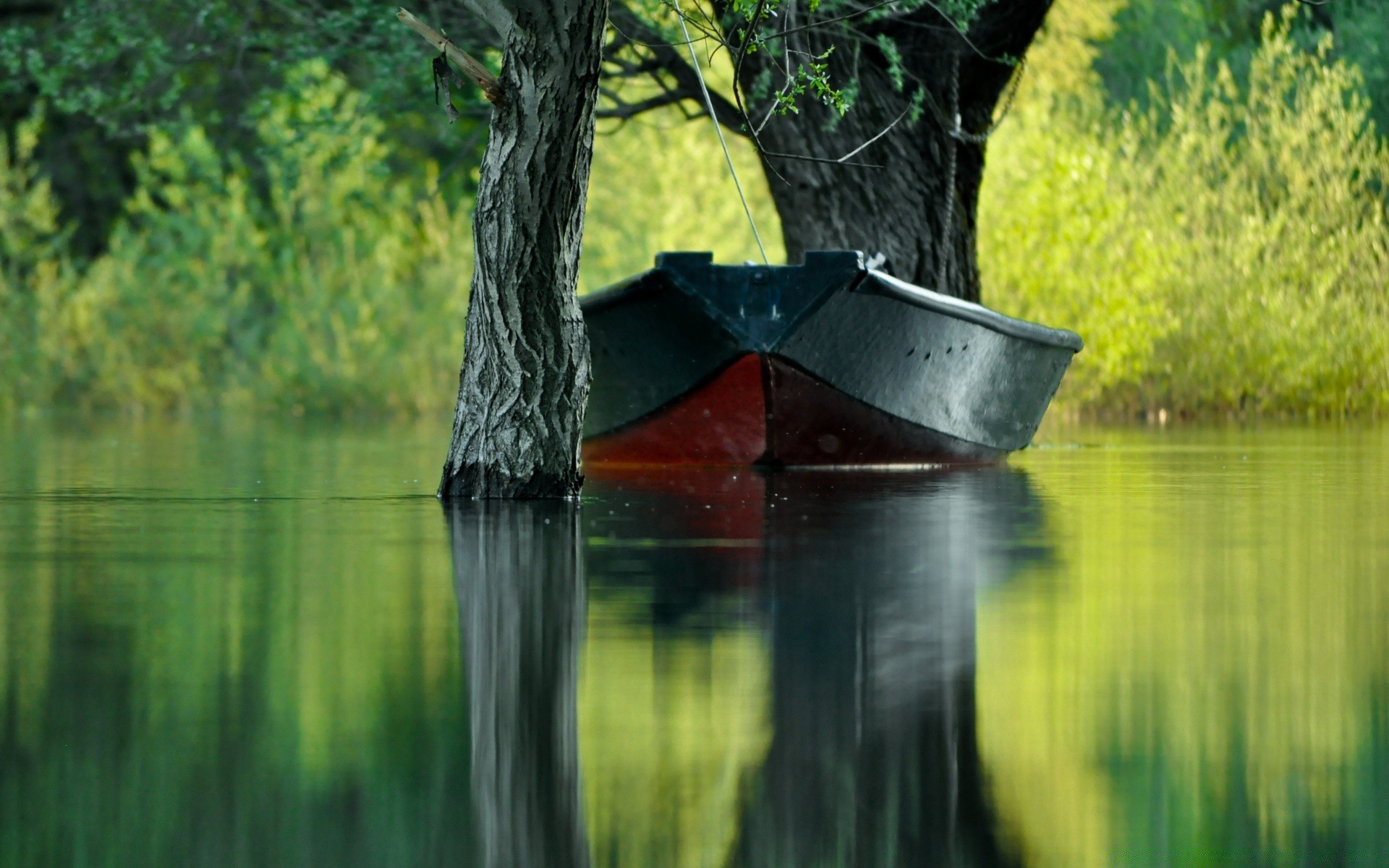 Le anatre nuotano sul lago e sono seguite da un cacciatore