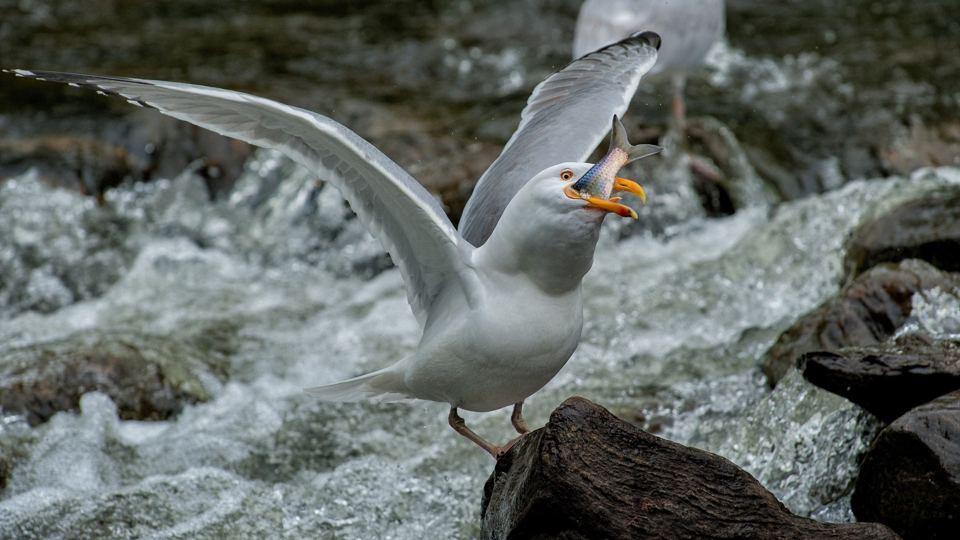Il Gabbiano cerca di ingoiare il pesce catturato