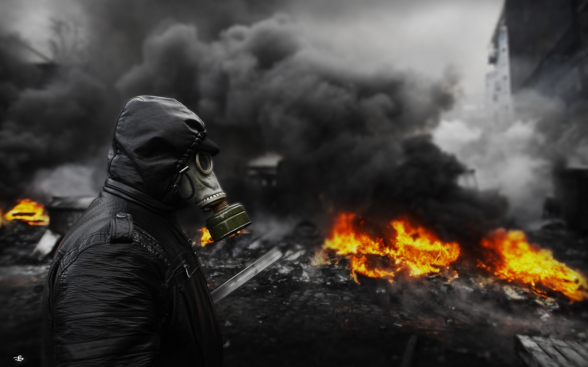 Fuoco di disastro naturale su uno sfondo di fumo nero con un uomo in maschera antigas