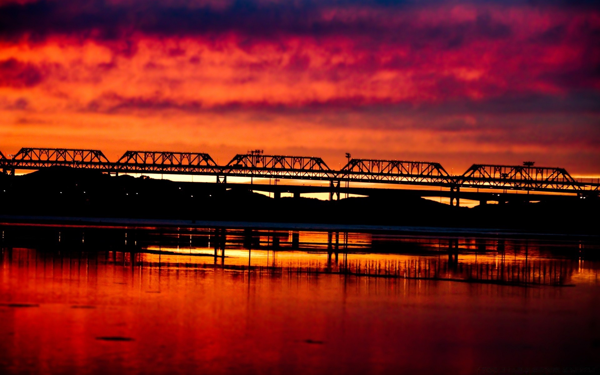 Nel riflesso dell'acqua, il ponte è visibile sullo sfondo del tramonto