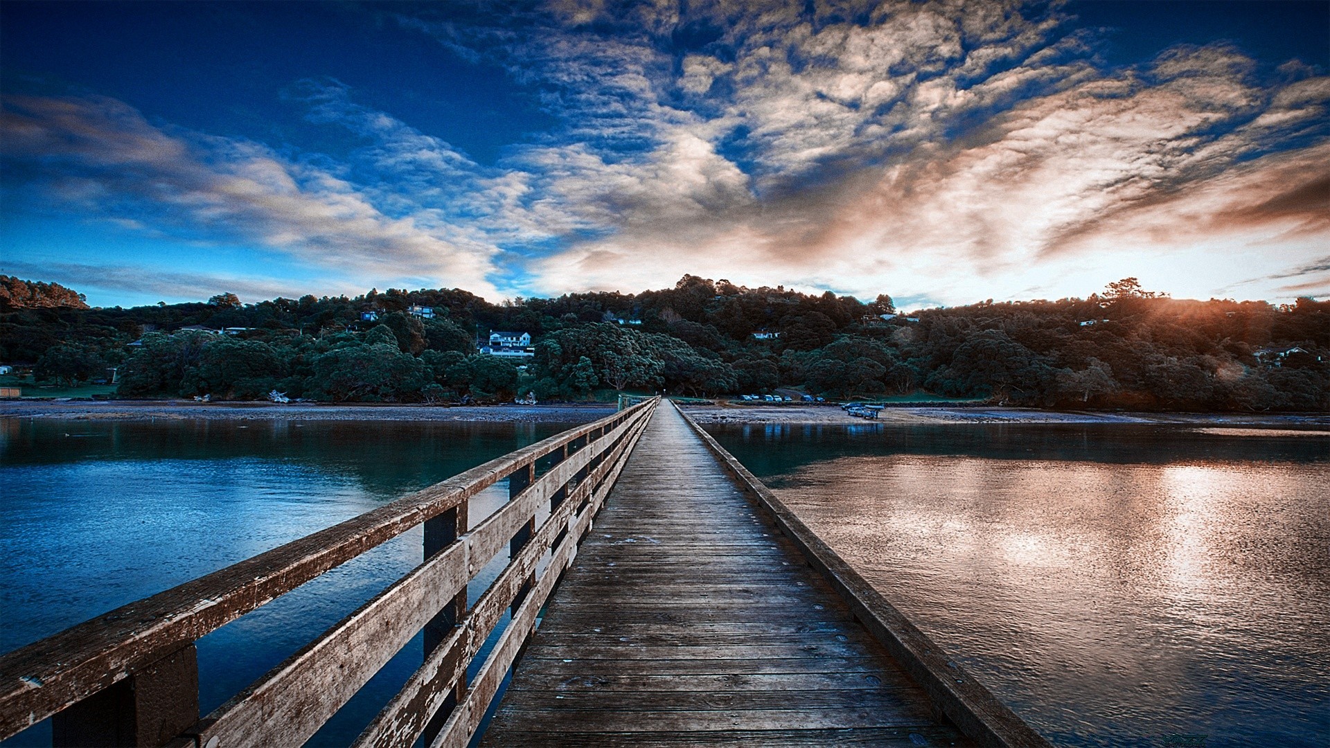 Ponte di legno sul fiume al tramonto
